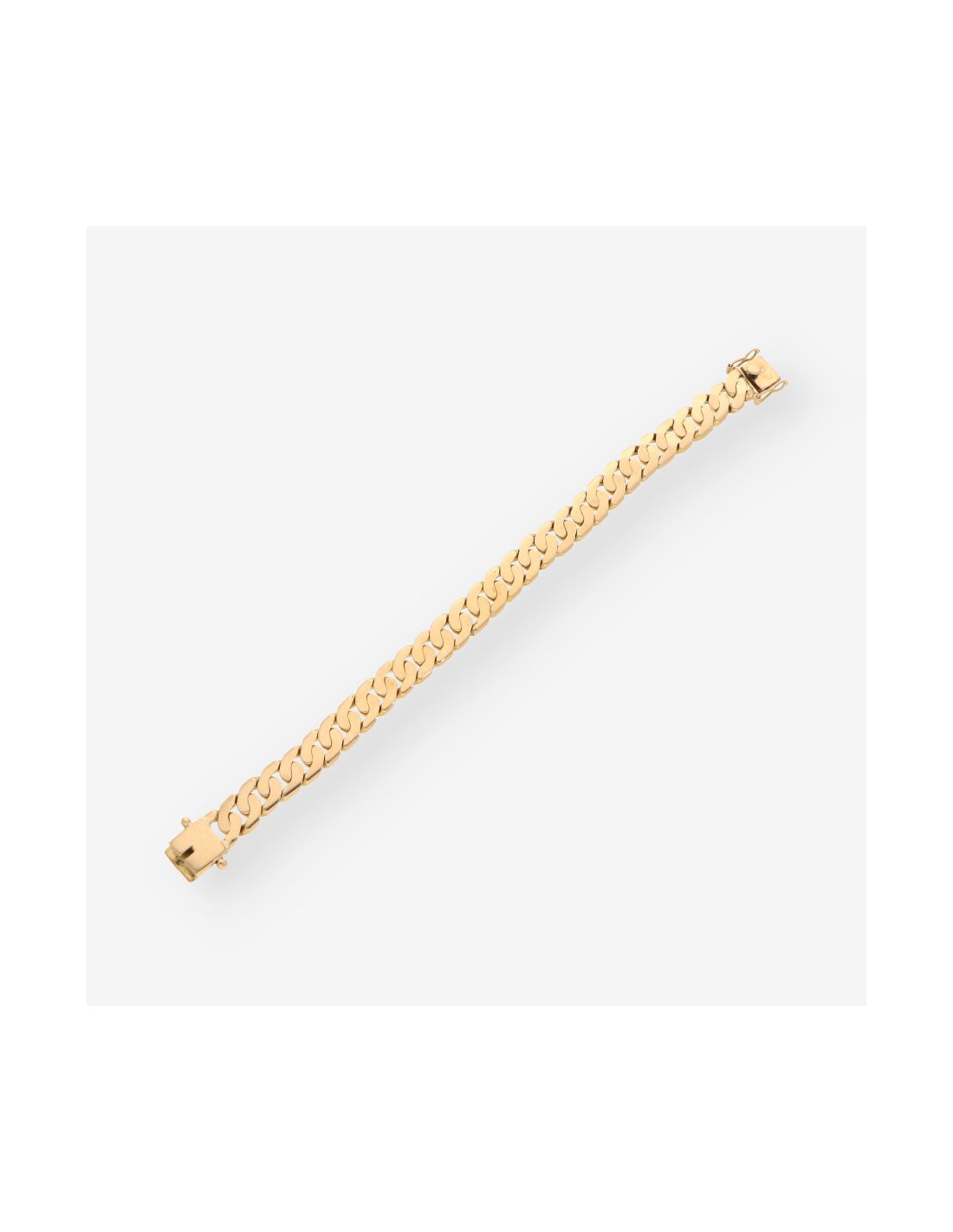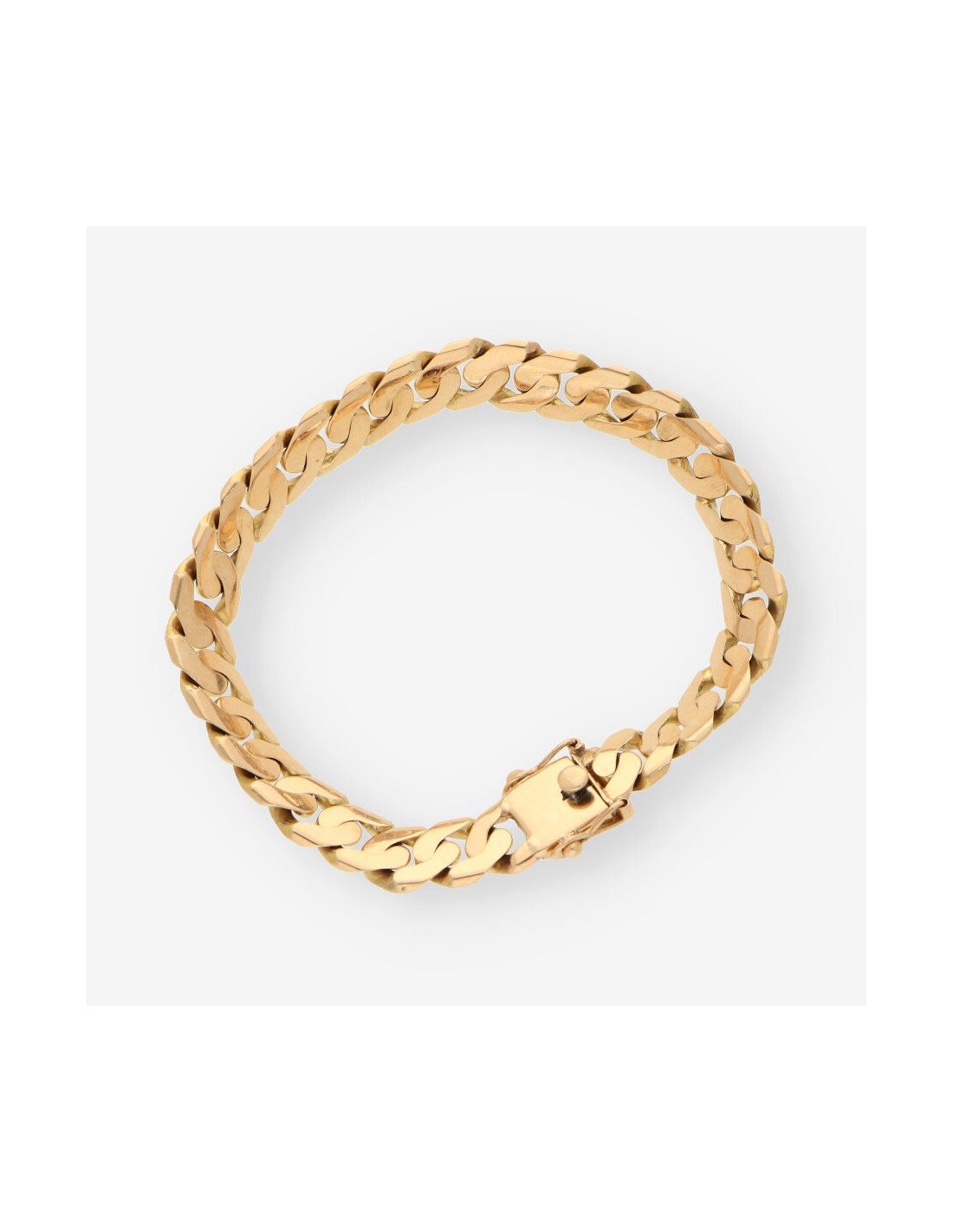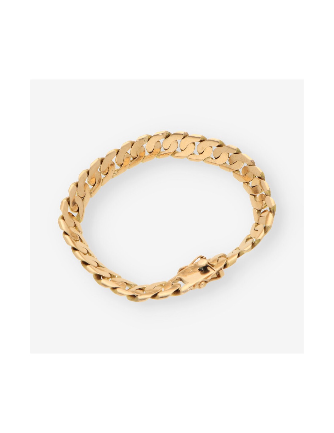 Pulsera barbada de segunda mano elaborada en oro amarillo de 18 quilates, con un diseño robusto y elegante que nunca pasa de moda. Con un largo de 20,5 cm, un ancho de 1 cm y un peso de 40 gramos, una opción ideal para quienes buscan un complemento de gran estilo y durabilidad.