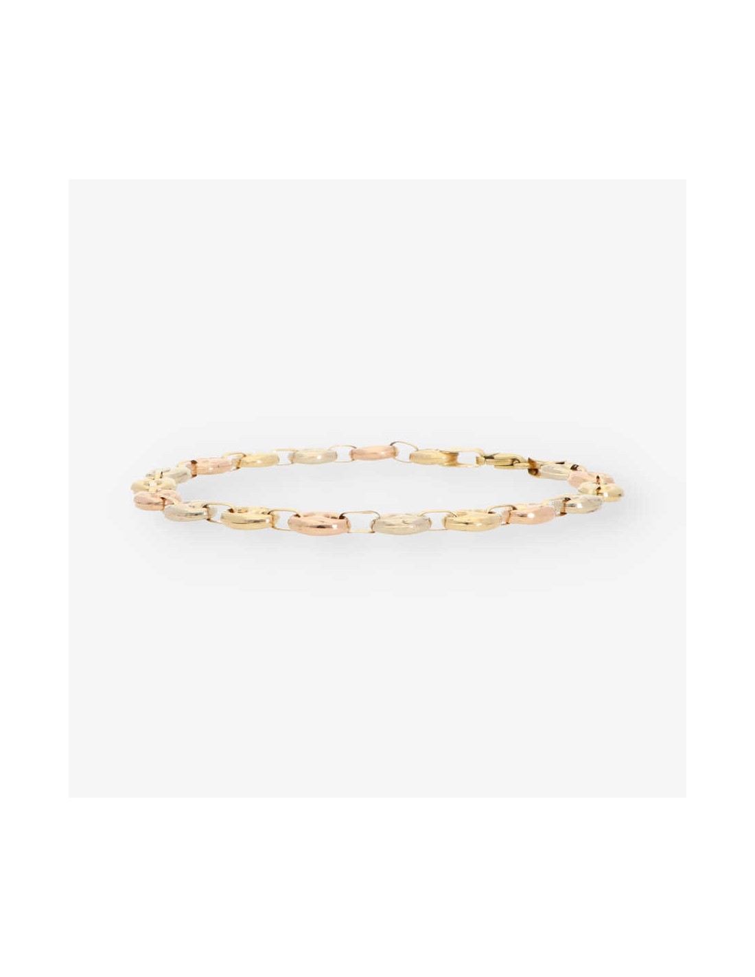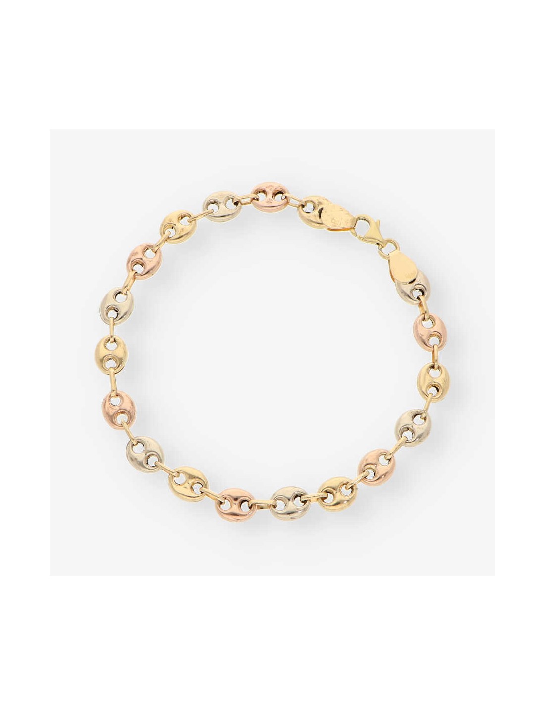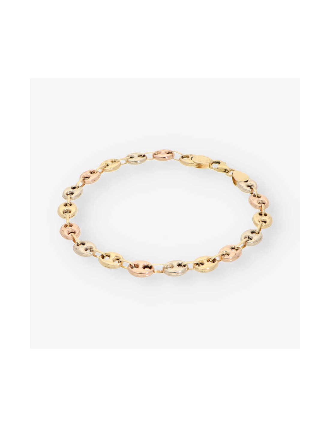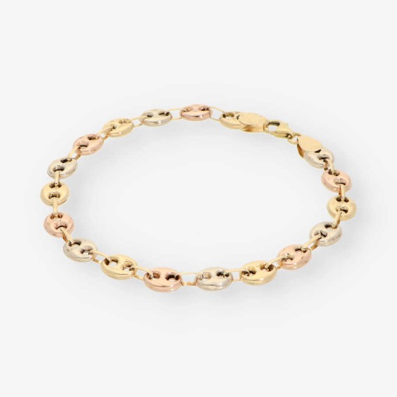 Magnifica pulsera de calabrotes de segunda mano en oro amarillo, rosa y blanco de primera ley. Una preciosa pieza además de llamativa, perfecto complemento. Longitud: 20.8cm. Ancho: 0.6cm. Peso: 5.6gr.