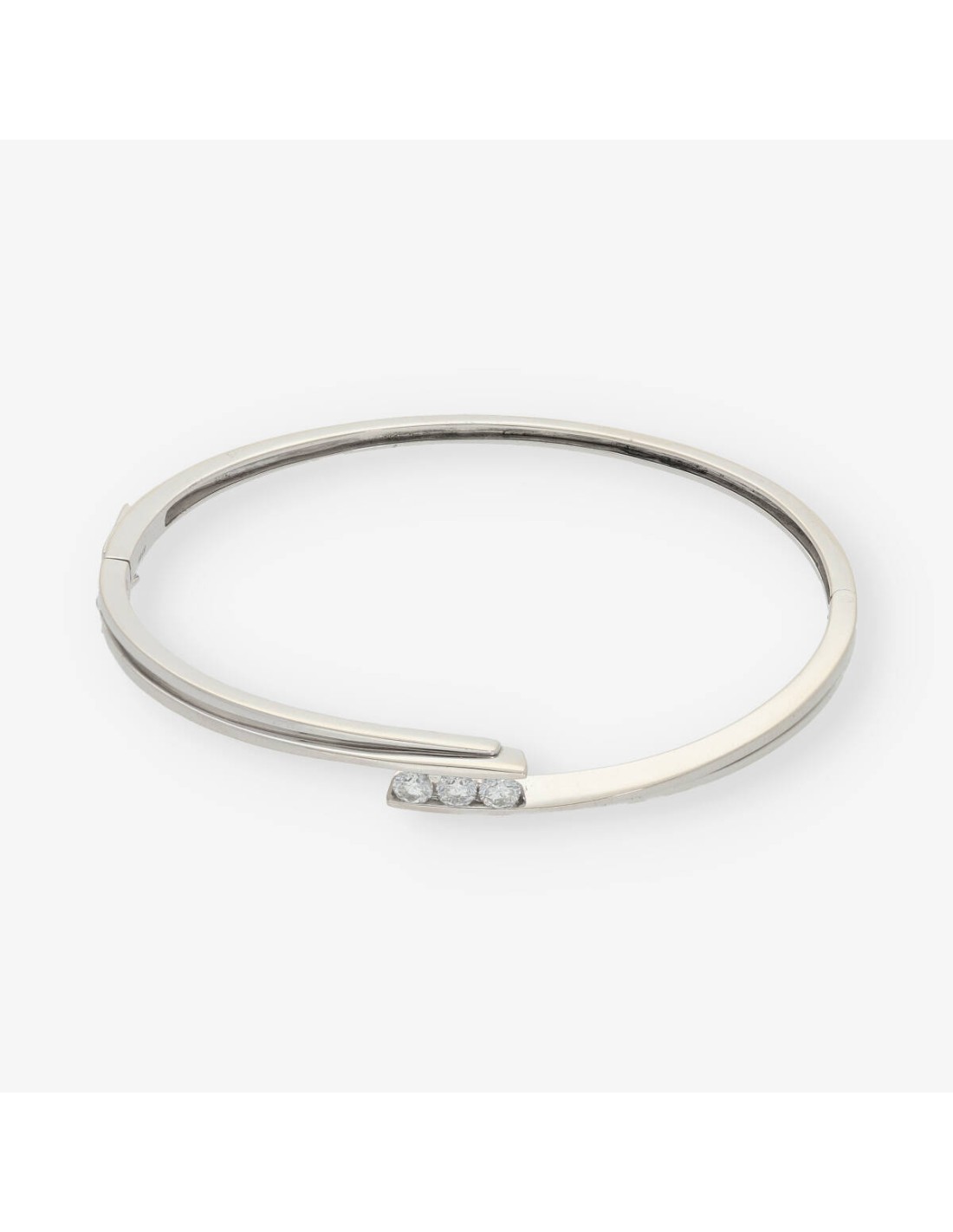 Preciosa pulsera de segunda mano en oro blanco de primera ley con brillante, un magnifico diseño ideal para  culaquier momentos. Diámetro: 6cm. Peso: 11.4gr.