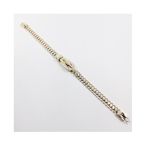 Pulsera de segunda mano en oro amarillo de 18 kt. en forma de cinturón. Detalles en oro blanco y rosa. Hebilla decorada con circonitas. Longitud: 18,2 cm. Peso: 15,2 g.