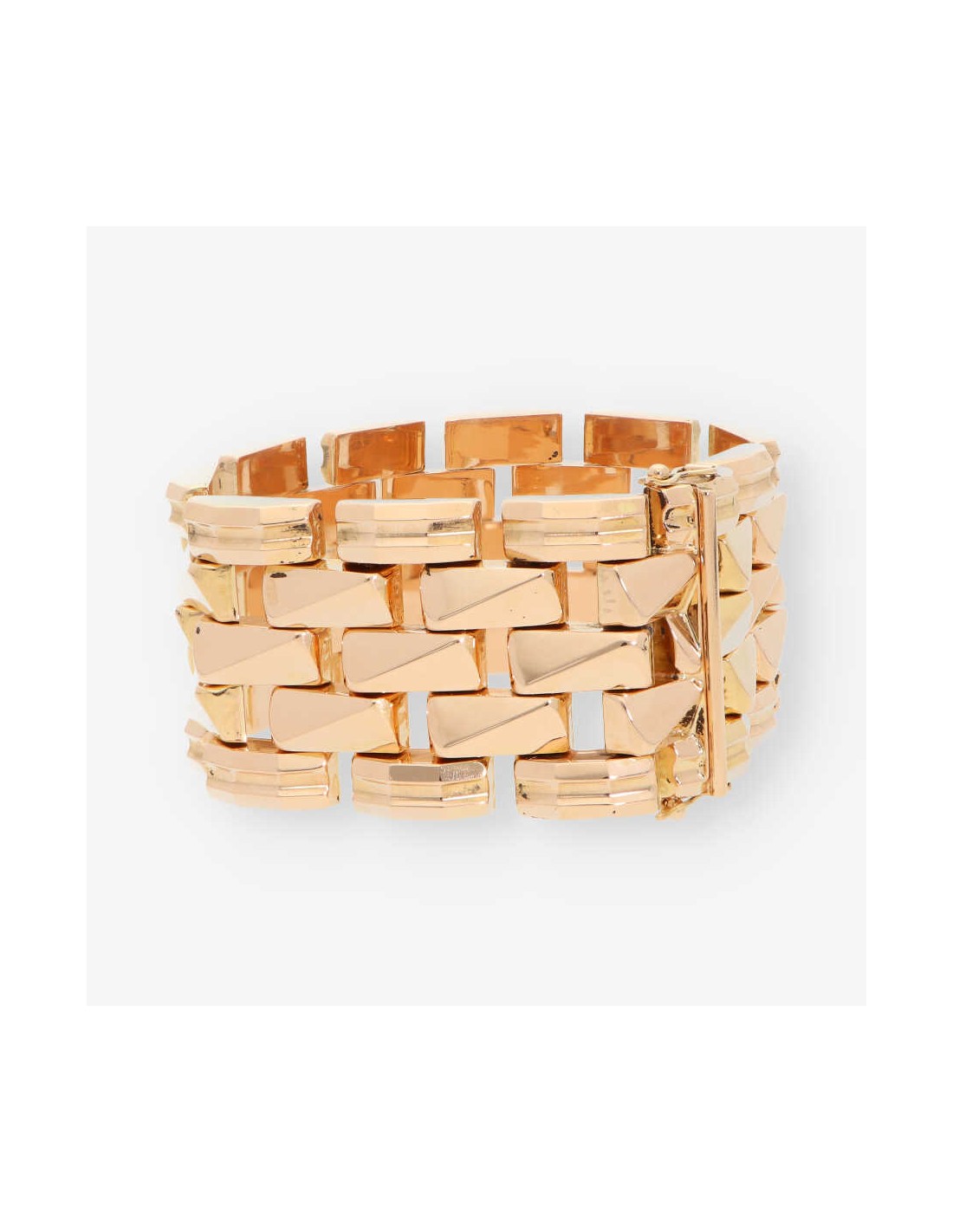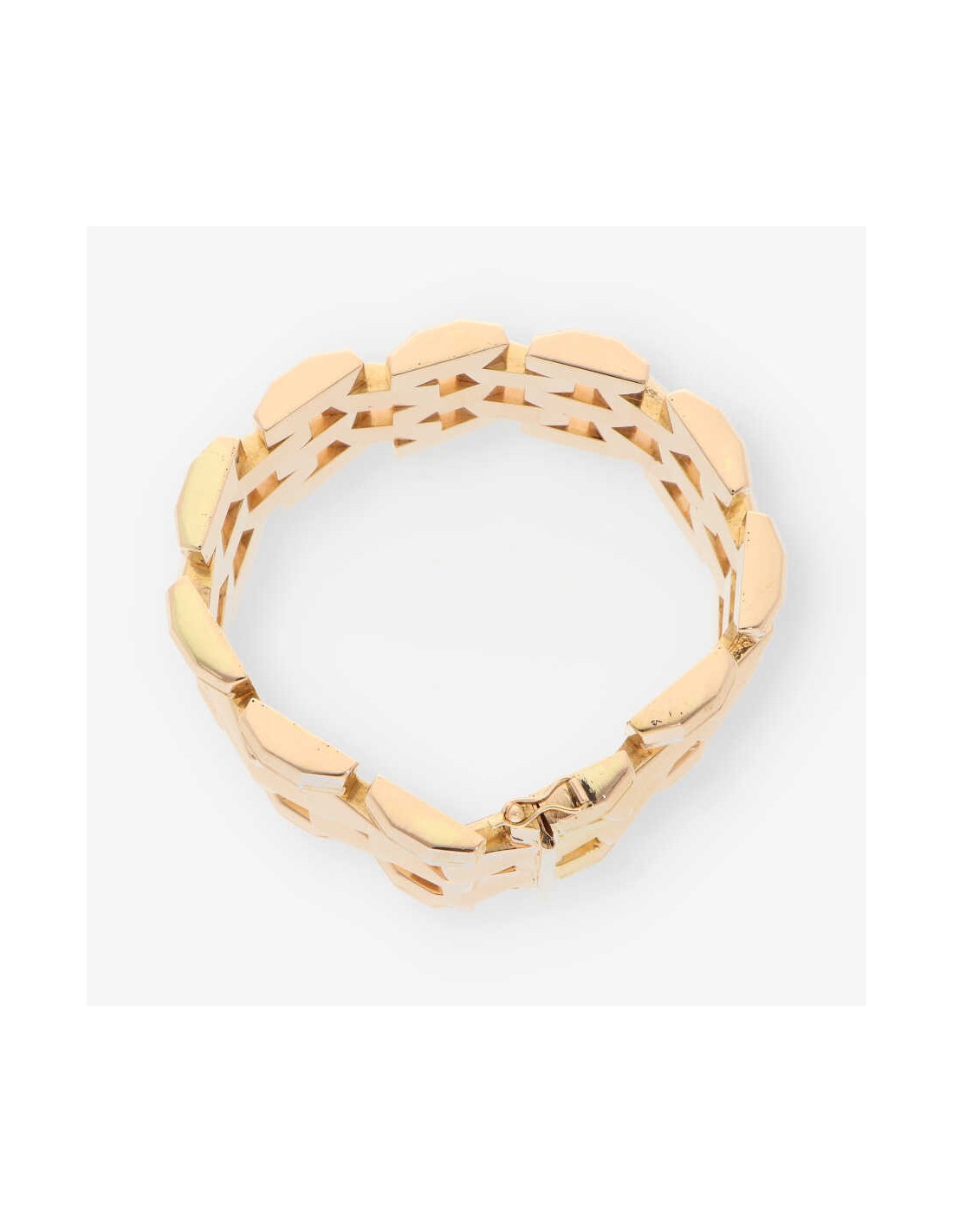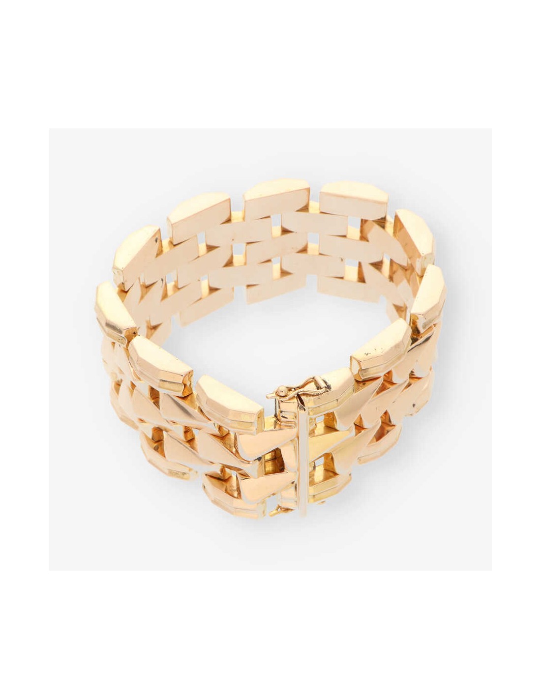 Preciosa pulsera vintage de segunda mano en oro amarillo de primera ley. Una pieza clásica y elegante, ideal para los amantes de pulseras. diámetro: 6.5cm. Grosor(máximo): 3.4cm. Peso: 96.7gr.