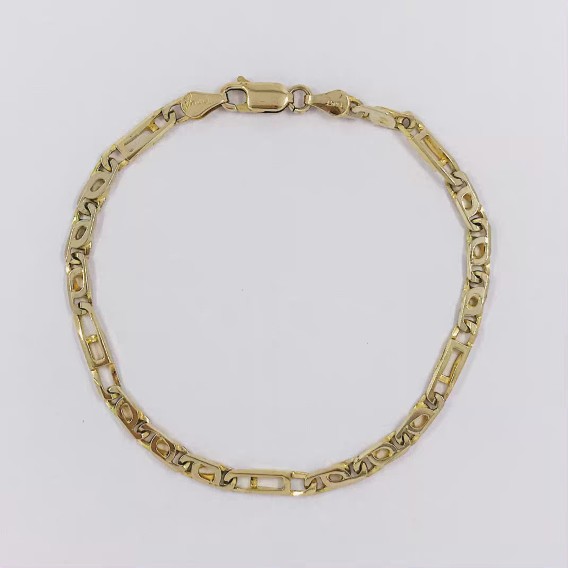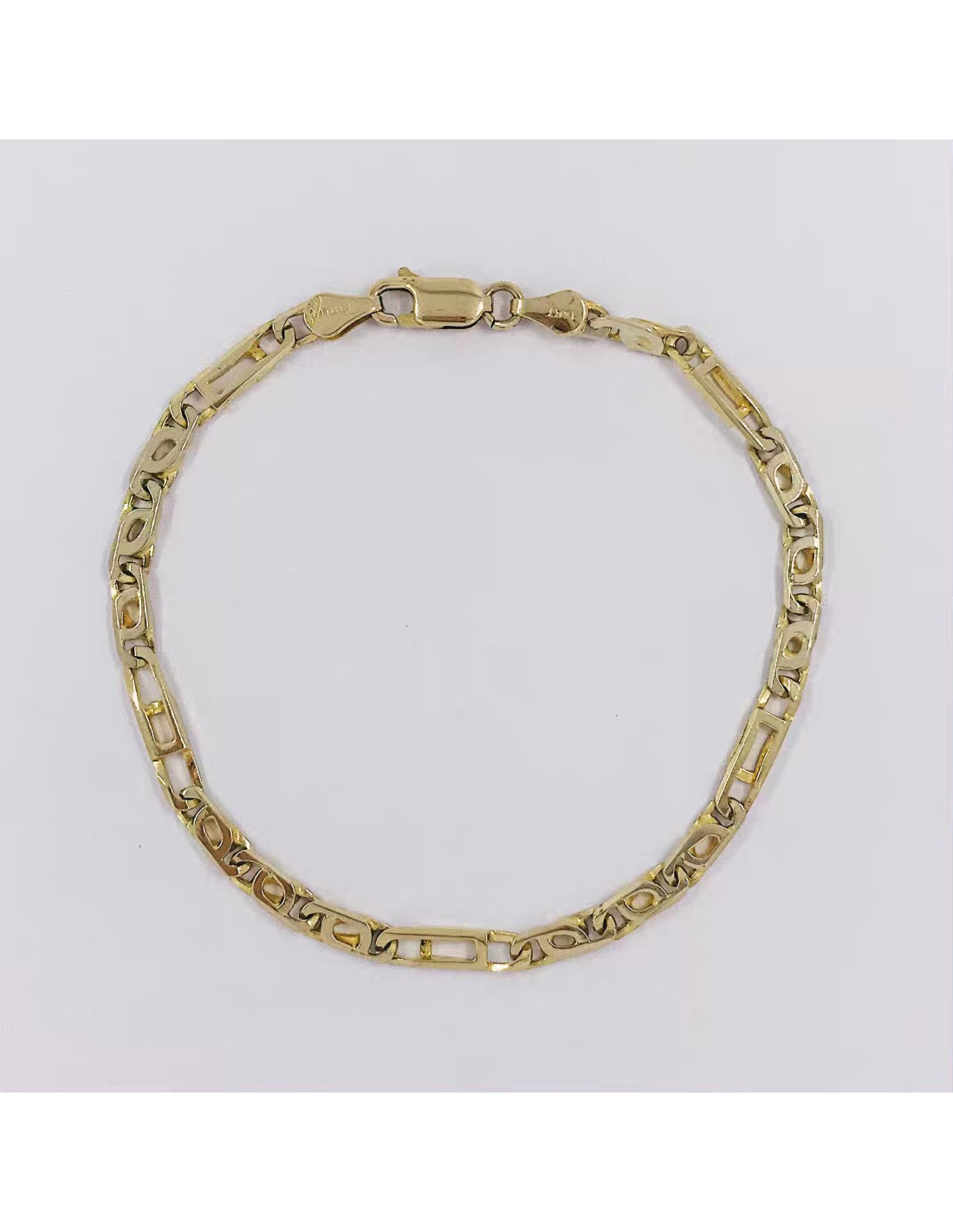 Preciosa pulsera de segunda mano en oro amarillo con dos tips de eslabones y clásico cierre de mosquetón. Un regalo ideal de cumpleaños. Longitud: 19,5cm. Peso: 7gr.