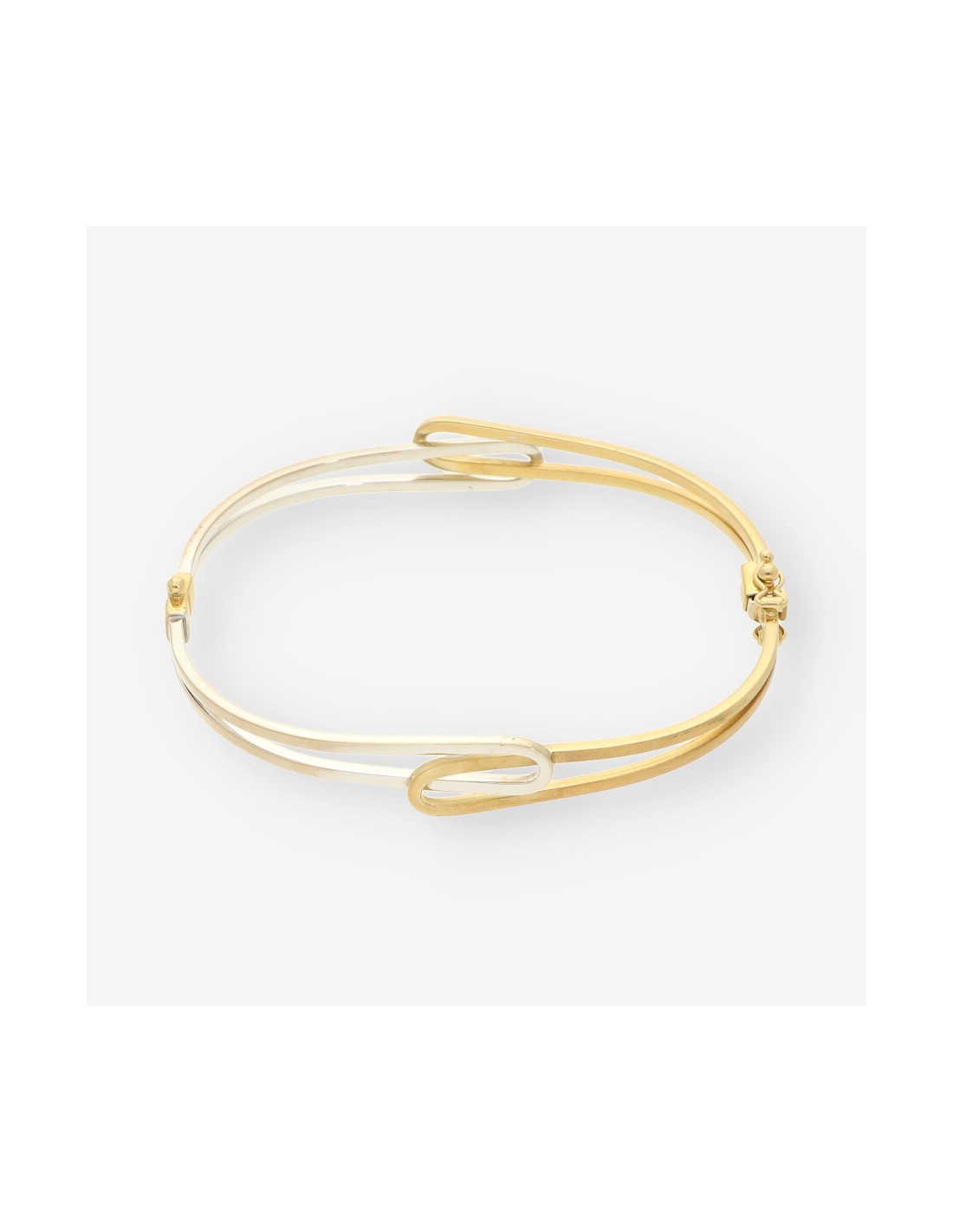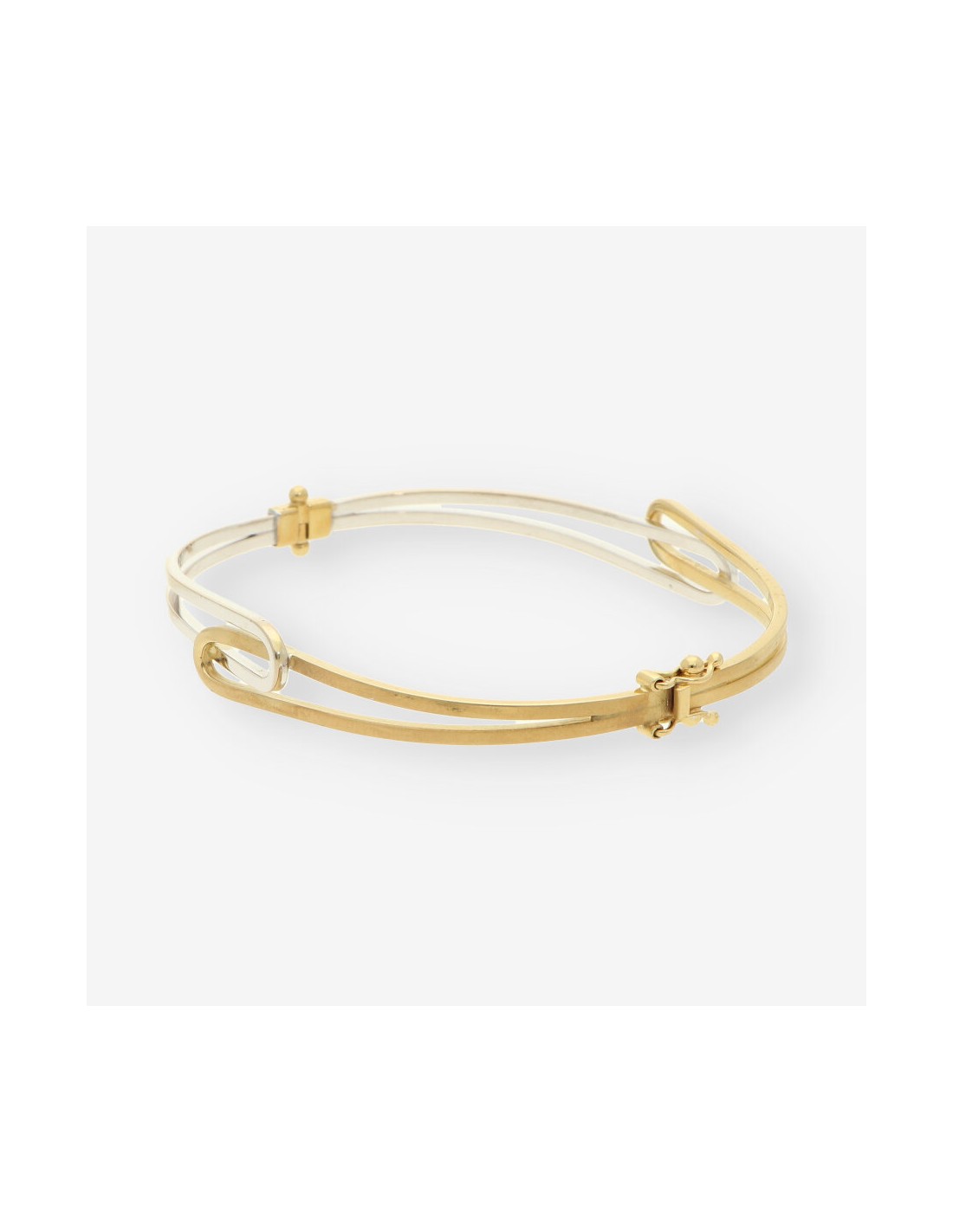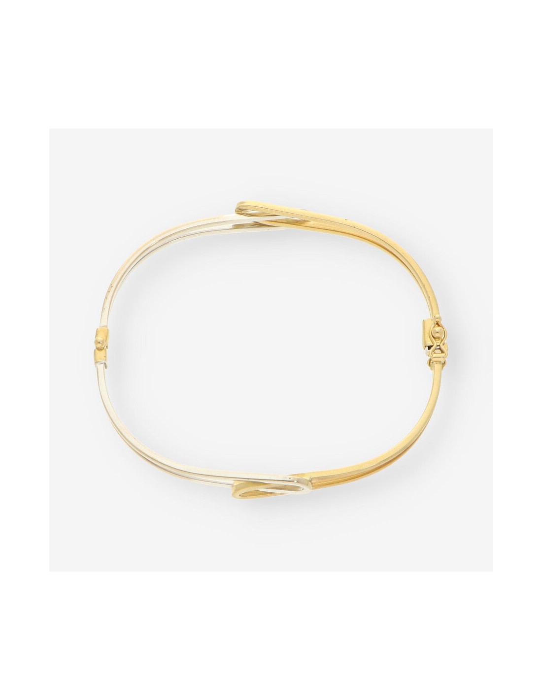 Preciosa pulsera esclava de segunda mano en oro blanco y amarillo de primera ley, con un diseño bicolor que combina sofisticación y elegancia. Con un diámetro de 6 cm, un ancho máximo de 0,9 cm y un peso de 11,4 gramos, es una joya distinguida y versátil, ideal para realzar cualquier ocasión con estilo.