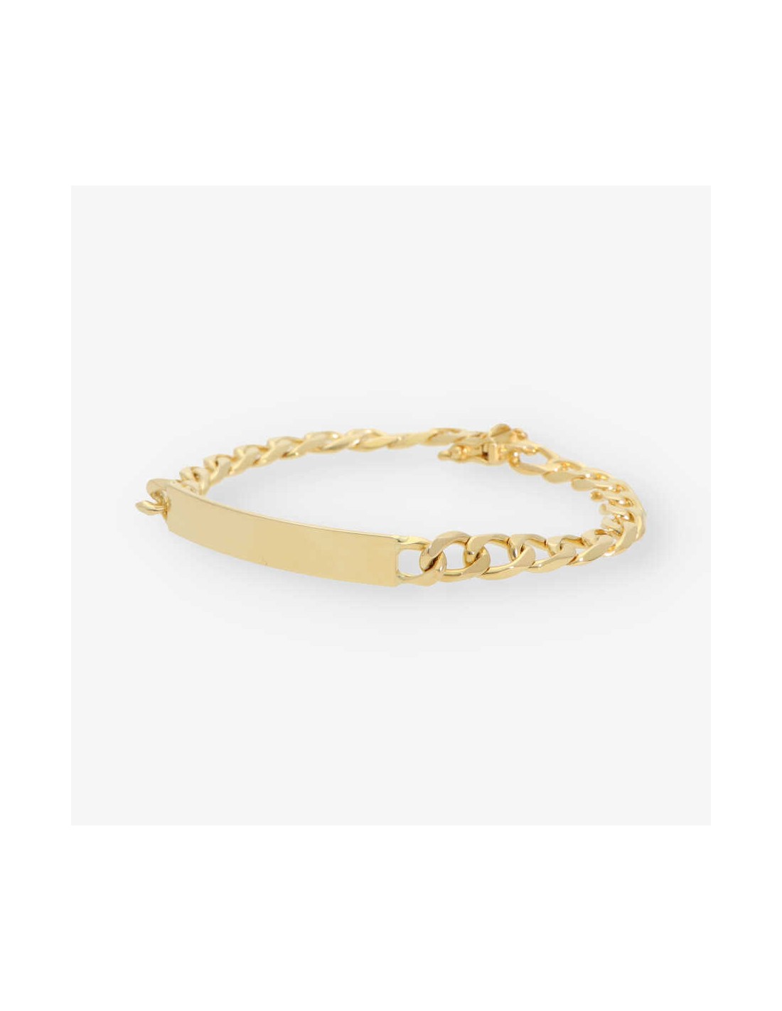 Preciosa pulsera nomeolvides nueva de TasadoresJoyeros en oro amarillo de primera ley con eslabones barbadas. Una pieza clásica y elegante, ideal para los amantes de pulseras. Longitud: 22cm. Grosor: 0.6cm. Ancho de la placa: 0.7cm. Peso: 25.6gr.