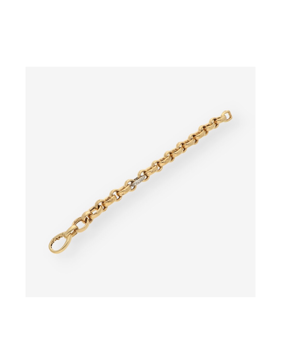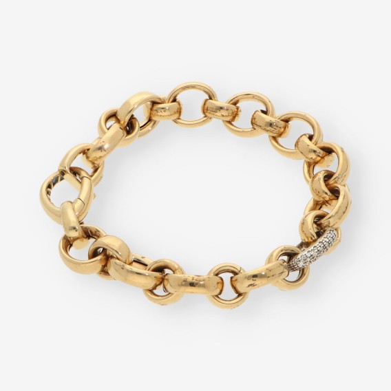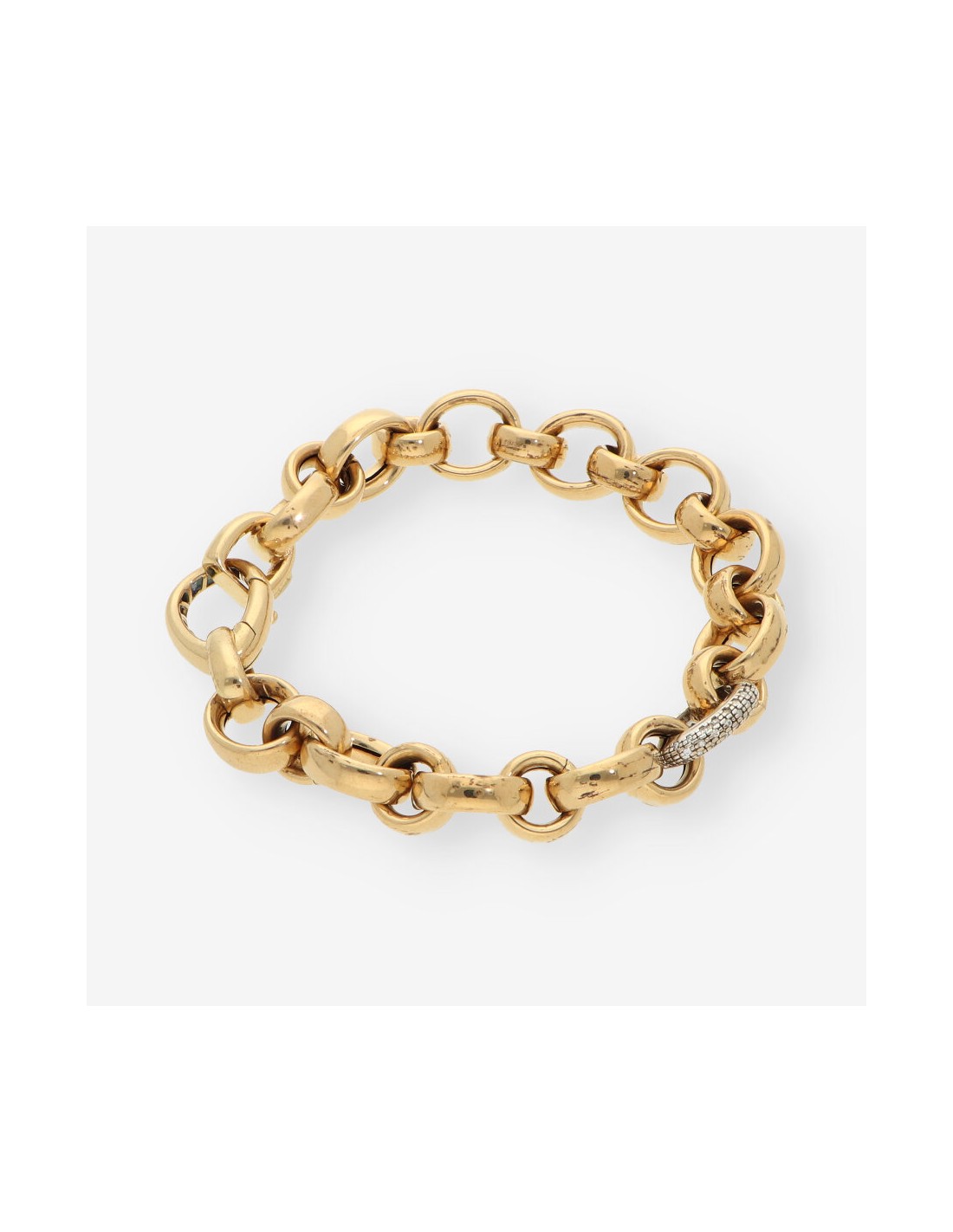 Pulsera de segunda mano en oro amarillo de primera ley, con eslabones de diseño robusto y elegante que aportan fuerza y distinción. Con un largo de 21 cm, un ancho de 1,1 cm y un peso de 20,7 gramos, es una joya de gran presencia y estilo atemporal, ideal para lucir en cualquier ocasión.