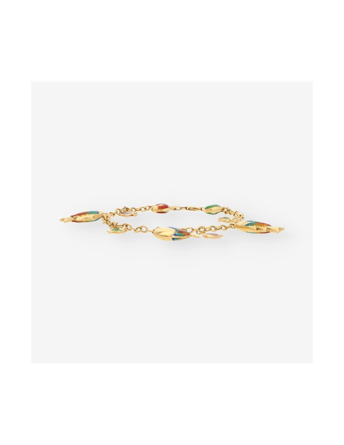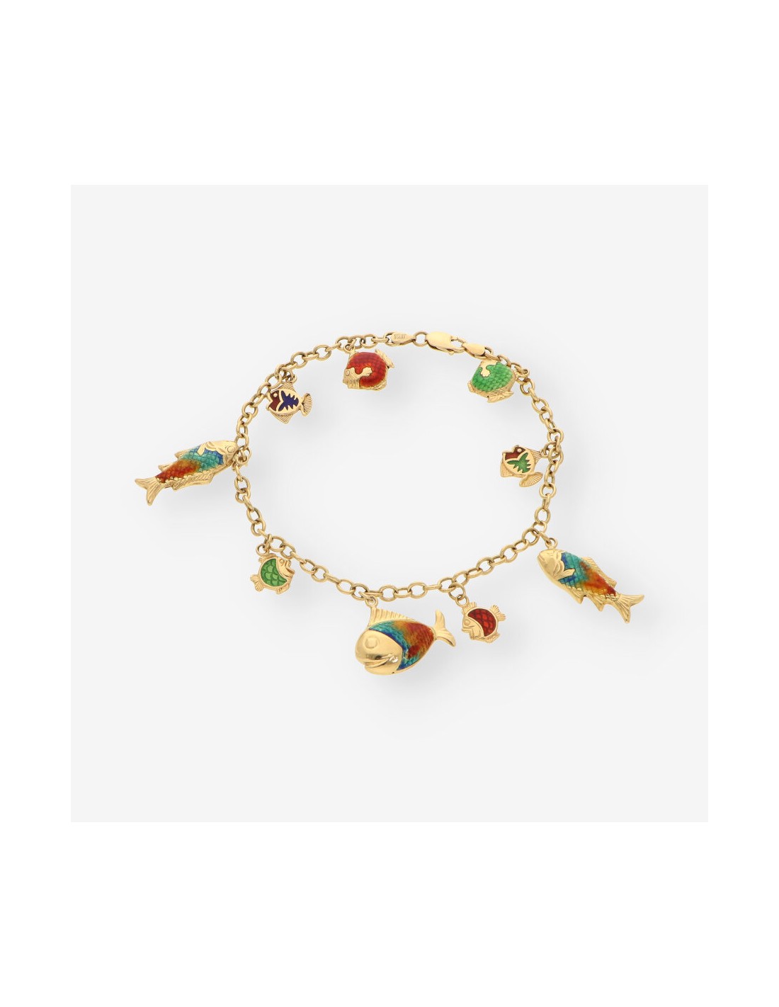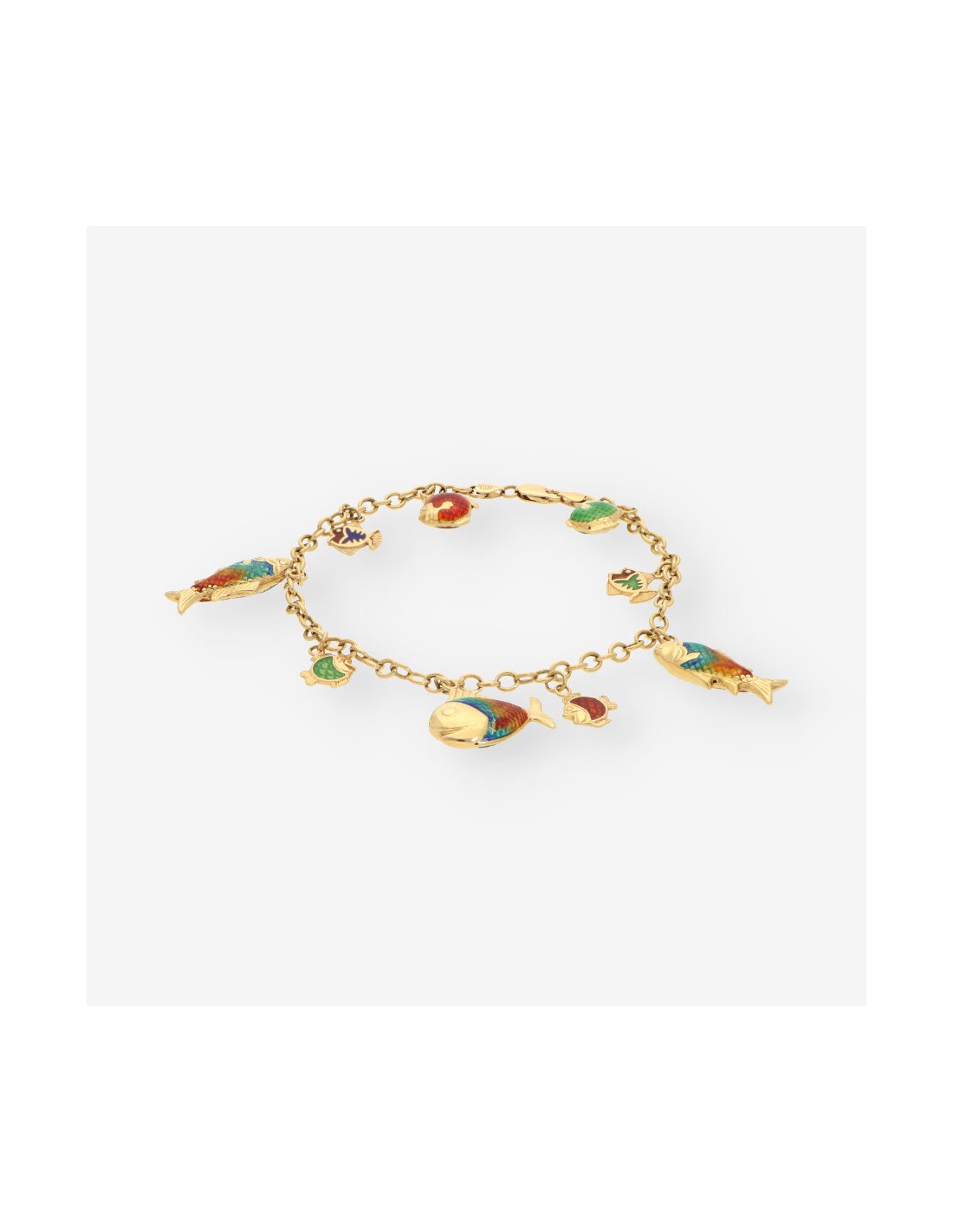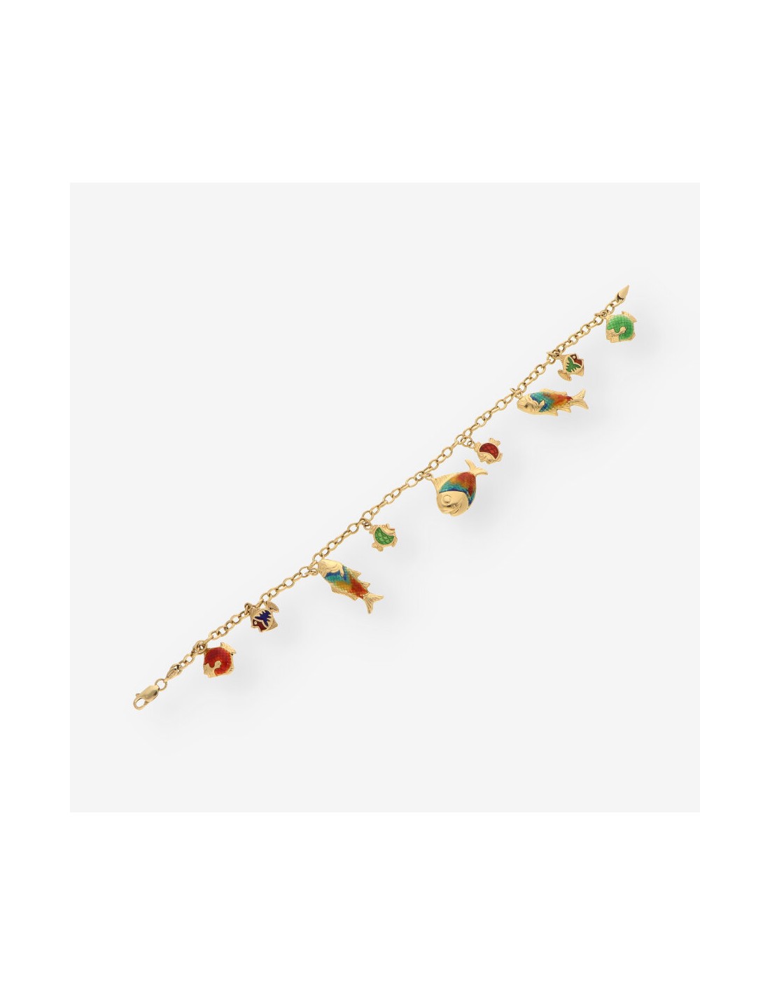 Pulsera con colgantes de peces en oro amarillo de 18 kt. Original y divertida pulsera elaborada en oro amarillo de 18 quilates, decorada con colgantes de peces. Cada motivo representa un pez con detalles vívidos y esmaltado multicolor artesanal. La cadena de eslabones cuenta con un cierre de mosquetón. Longitud total de 20,5 cm. Peso: 15,44 gramos. Una pieza única que combina elegancia, color y un toque marino encantador.