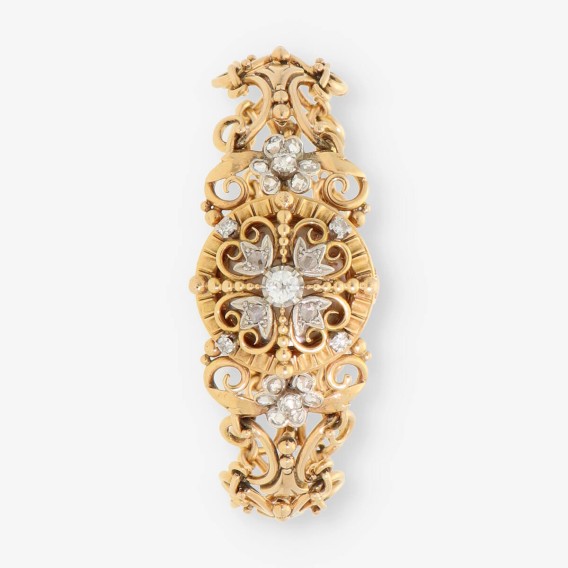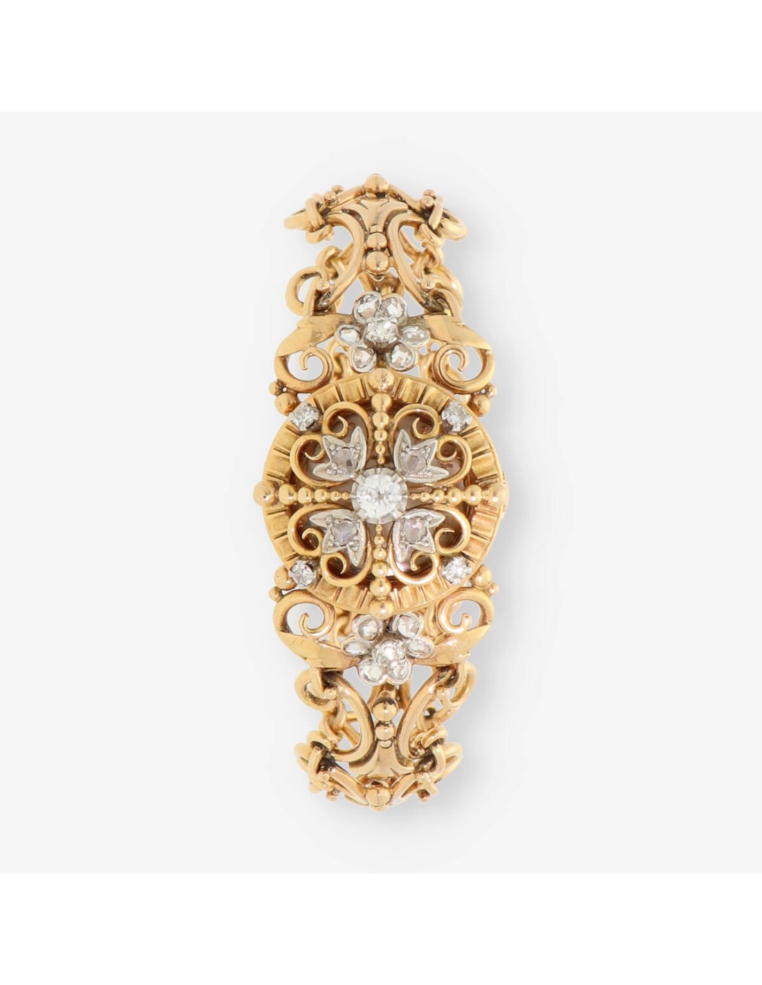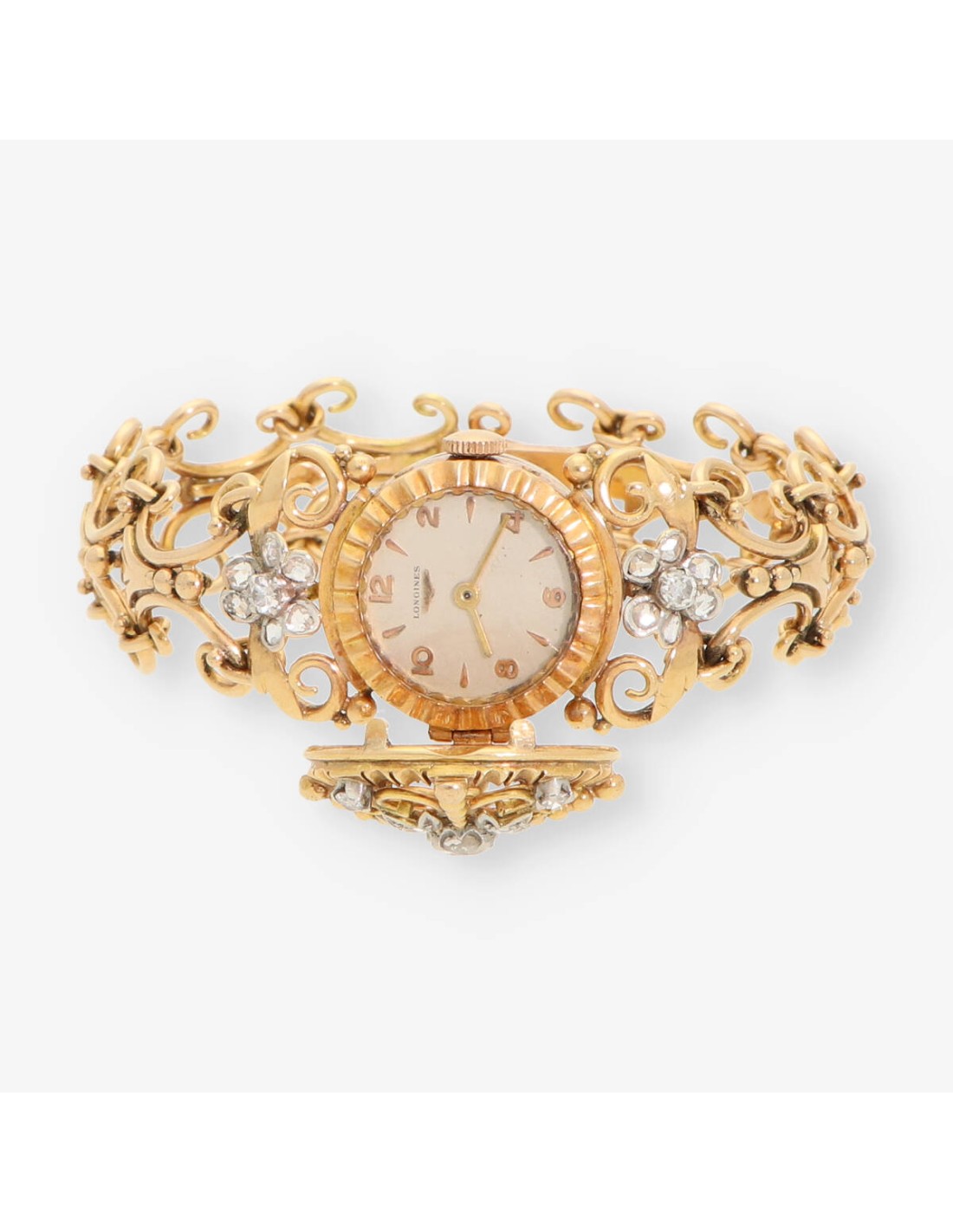 Maravillosa pulsera vintage de segunda mano en oro amarillo de primera mano con brillantes en la parte frontal que al mismo tiempo es la tapa que cubre el reloj Longines de 22mm. con cuerda manual que hay en su interior. Una verdadera obra de arte. Peso: 37.96gr. Largo de pulsera: 17cm.