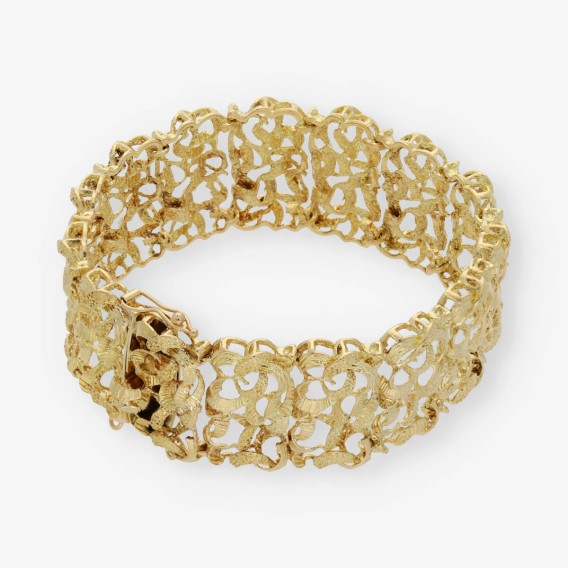 Preciosa pulsera semirrígida de segunda mano en oro de primera ley. Una pieza clásica y elegante, ideal para los amantes de pulseras. Longitud: 20.5cm. Grosor: 2.4cm. Peso: 45.9gr.