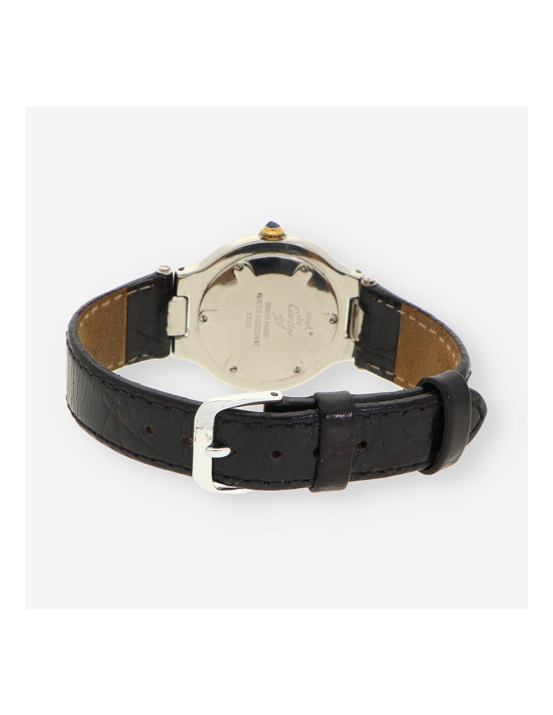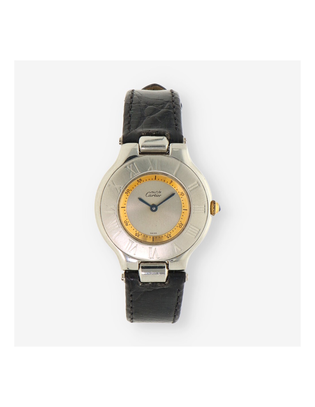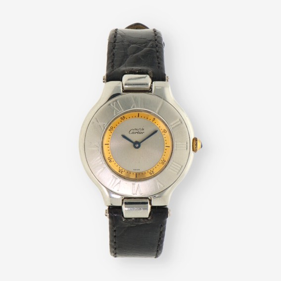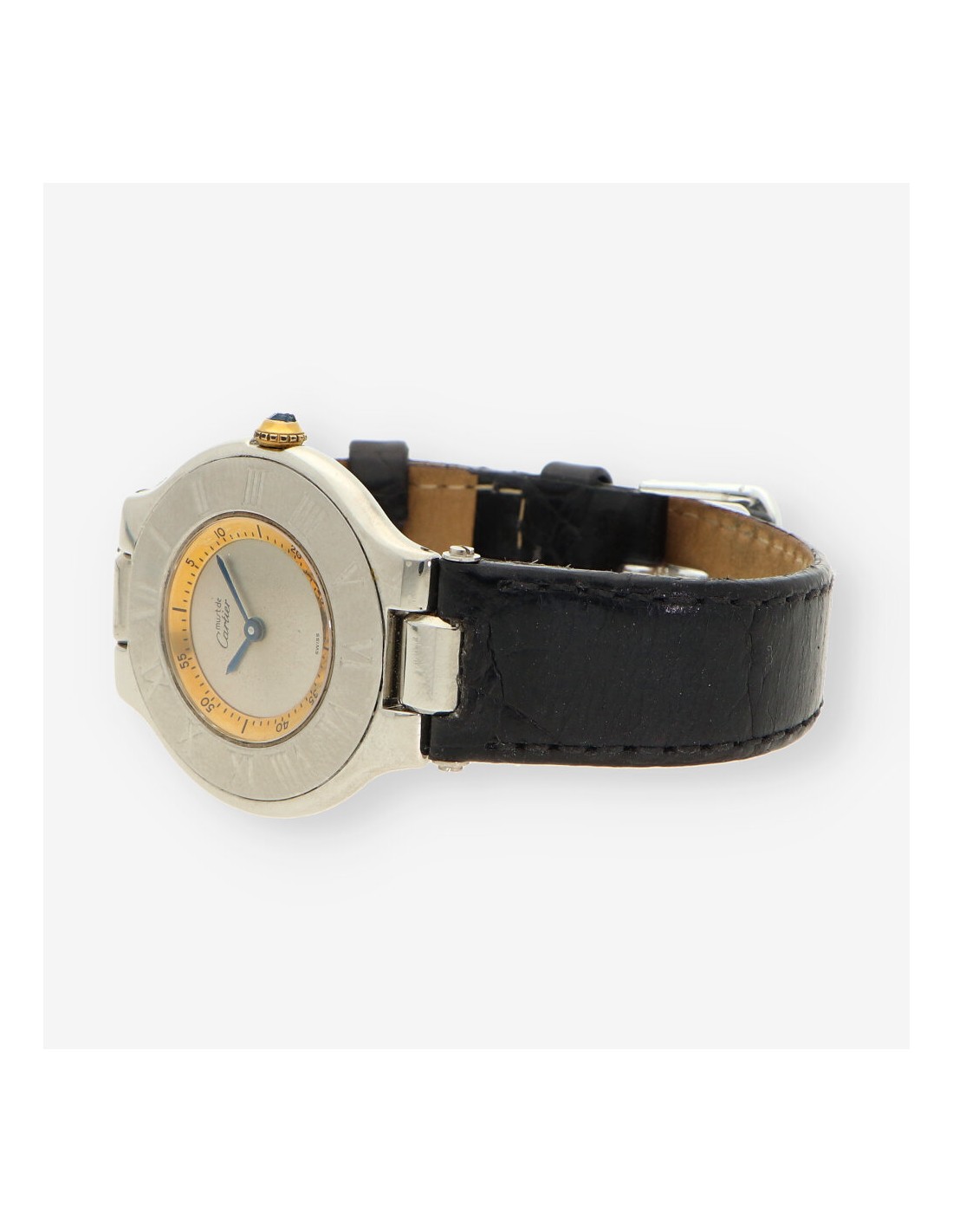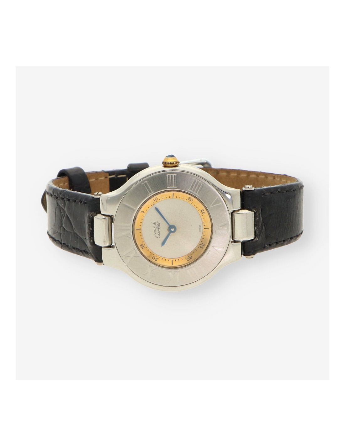 Precioso 21 Must de Cartier en acero y oro con calibre de cuarzo, caja de 31 mm y bisel bicolor. Su esfera blanca aporta un aire clásico, mientras que la correa de piel en color negro con cierre desplegable doble en acero combina comodidad y elegancia. Un reloj refinado y atemporal que refleja el estilo inconfundible de Cartier.
