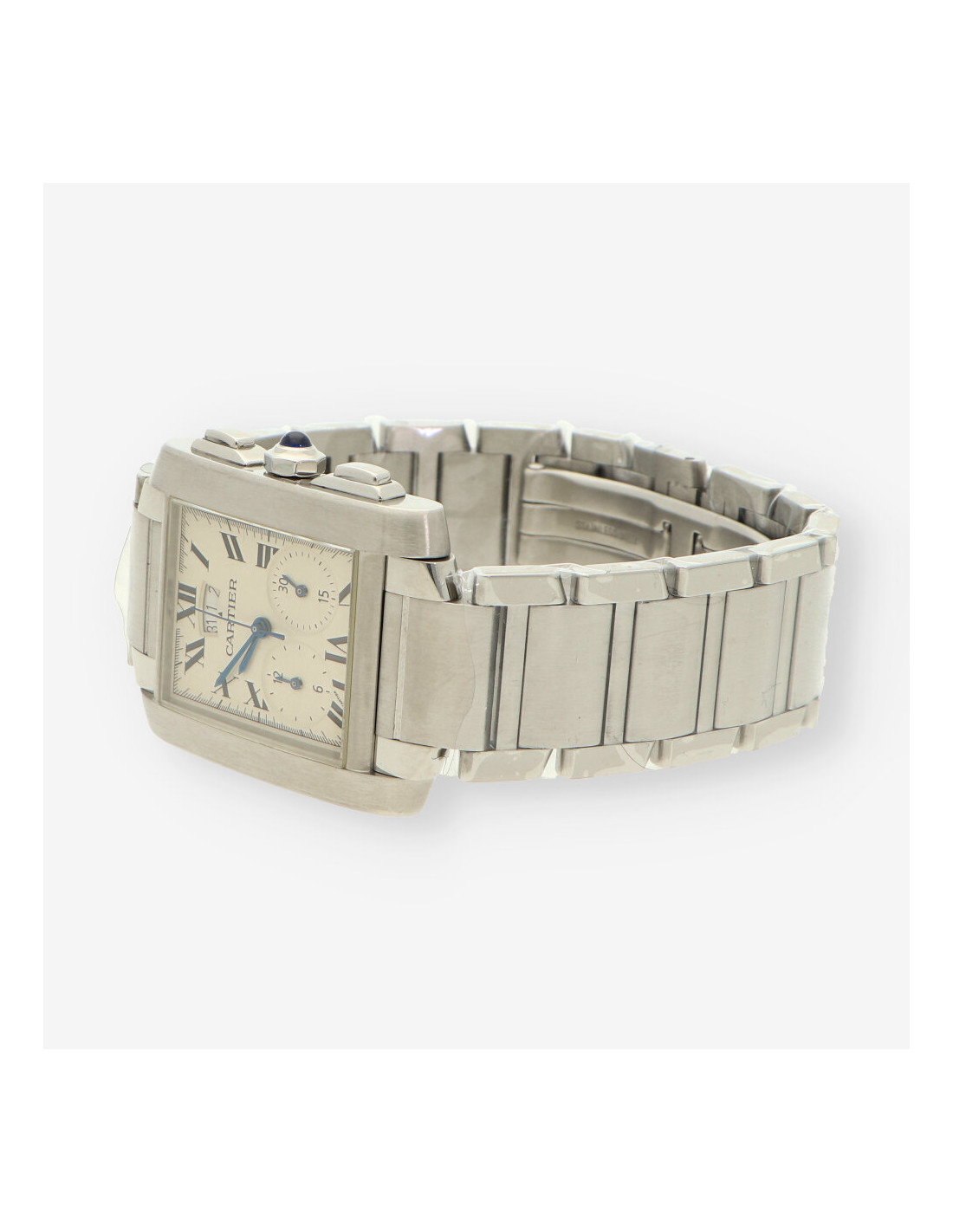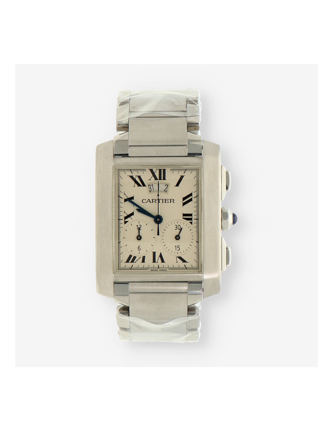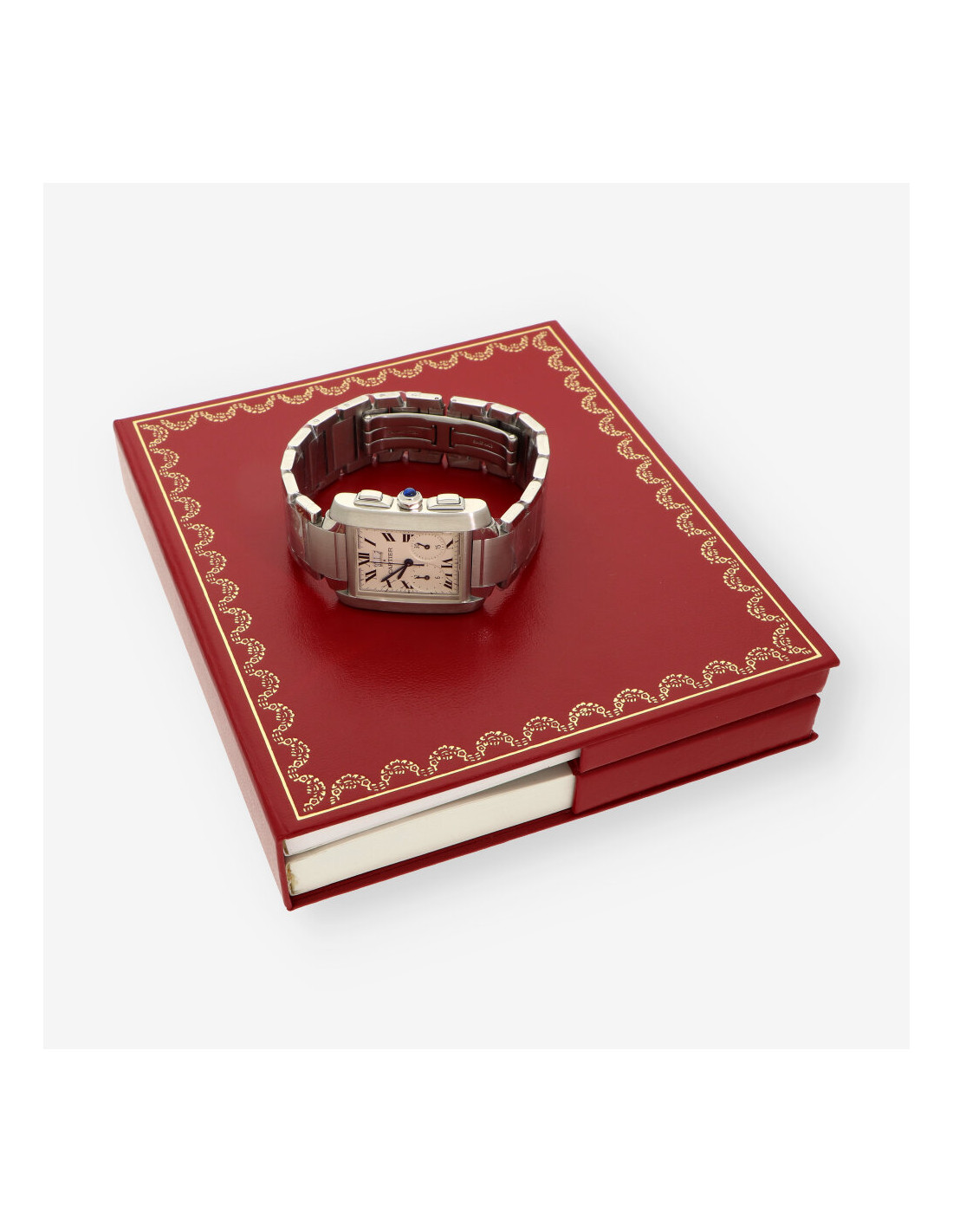 Este elegante reloj Cartier Tank Crono, modelo W51024Q3 del año 2006, está elaborado en acero y cuenta con un calibre de cuarzo. Su caja mide 28 x 36 mm y alberga una esfera blanca que ofrece un diseño clásico y refinado. La pulsera de acero completa el conjunto, aportando un toque de modernidad y elegancia. Incluye caja y documentos que certifican su autenticidad, ideal para quienes buscan un reloj que combine prestigio y estilo atemporal.
