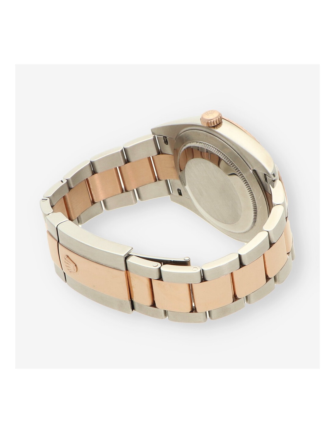 Este reloj Rolex Datejust de 41mm, referencia 126331, no es solo un ejemplo de la excelencia en relojería suiza, sino también un tributo al prestigioso torneo de tenis de Wimbledon. Combina a la perfección el acero inoxidable con el oro rosa de 18 quilates, ofreciendo un diseño bicolor que resalta tanto en ocasiones formales como en eventos deportivos. La esfera especial "Wimbledon" se distingue por su fondo oscuro y números romanos en verde distintivo, colores que evocan la tradición y el espíritu del torneo. Esta pieza incluye una ventana de fecha claramente visible a las 3 en punto con una lente Cyclops para una fácil lectura. El reloj no solo es un símbolo de precisión y durabilidad, sino también de estilo y pasión por el tenis. Perfecto para los aficionados del deporte y coleccionistas de relojes exclusivos, este modelo refleja un equilibrio perfecto entre deportividad y lujo.