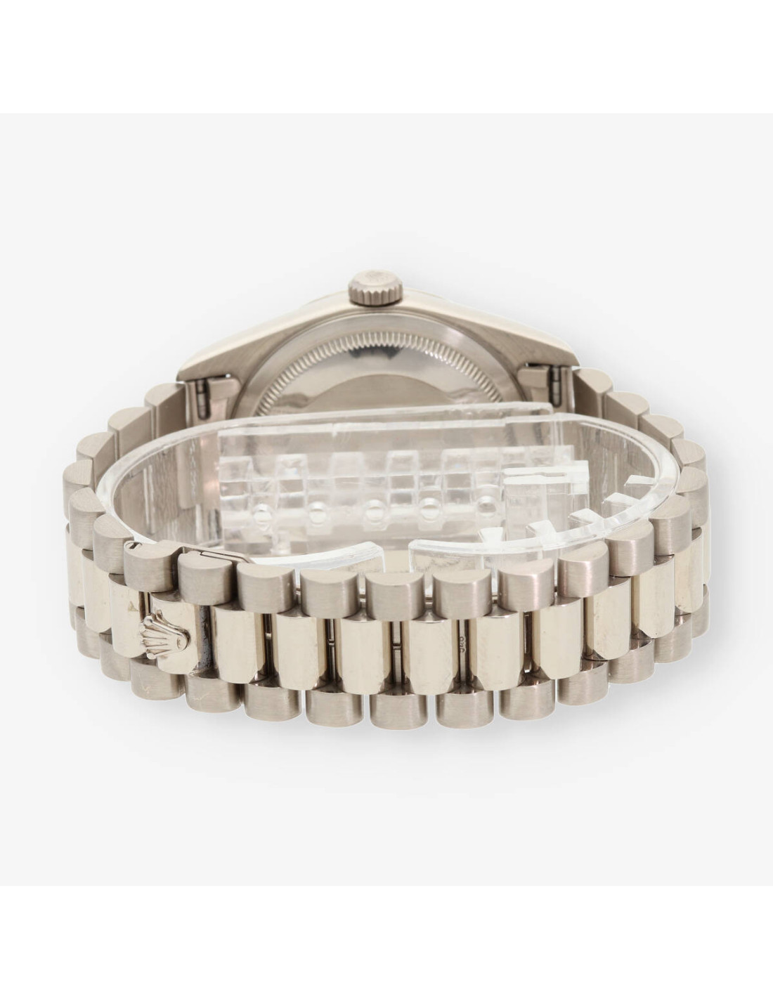 Este distinguido reloj Rolex President, modelo 18239 del año 1995, está elaborado en oro blanco de primera ley. Equipado con el calibre automático 3155, ofrece una reserva de marcha de 48 horas y cuenta con 31 joyas para un rendimiento preciso. La caja de 36 mm, resistente al agua hasta 10 ATM, está protegida por un cristal de zafiro. Su esfera en tono plata sin cifras añade un estilo elegante y sofisticado. La pulsera y el cierre desplegable, ambos en oro blanco, completan este diseño clásico. Incluye caja y documentos que certifican su autenticidad.