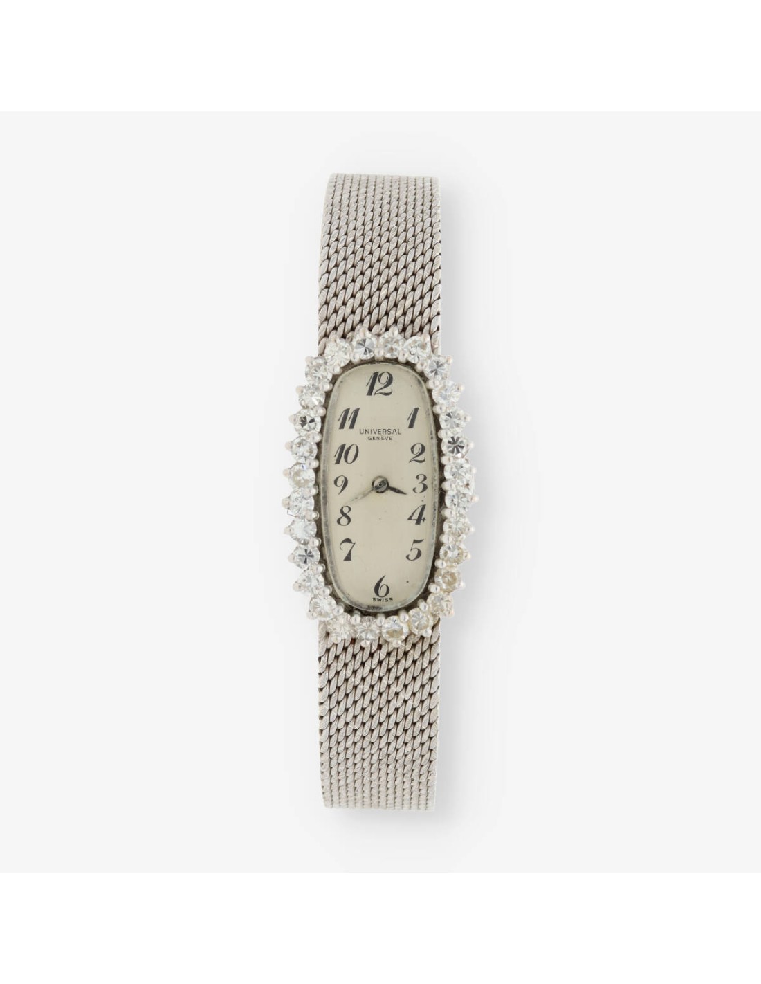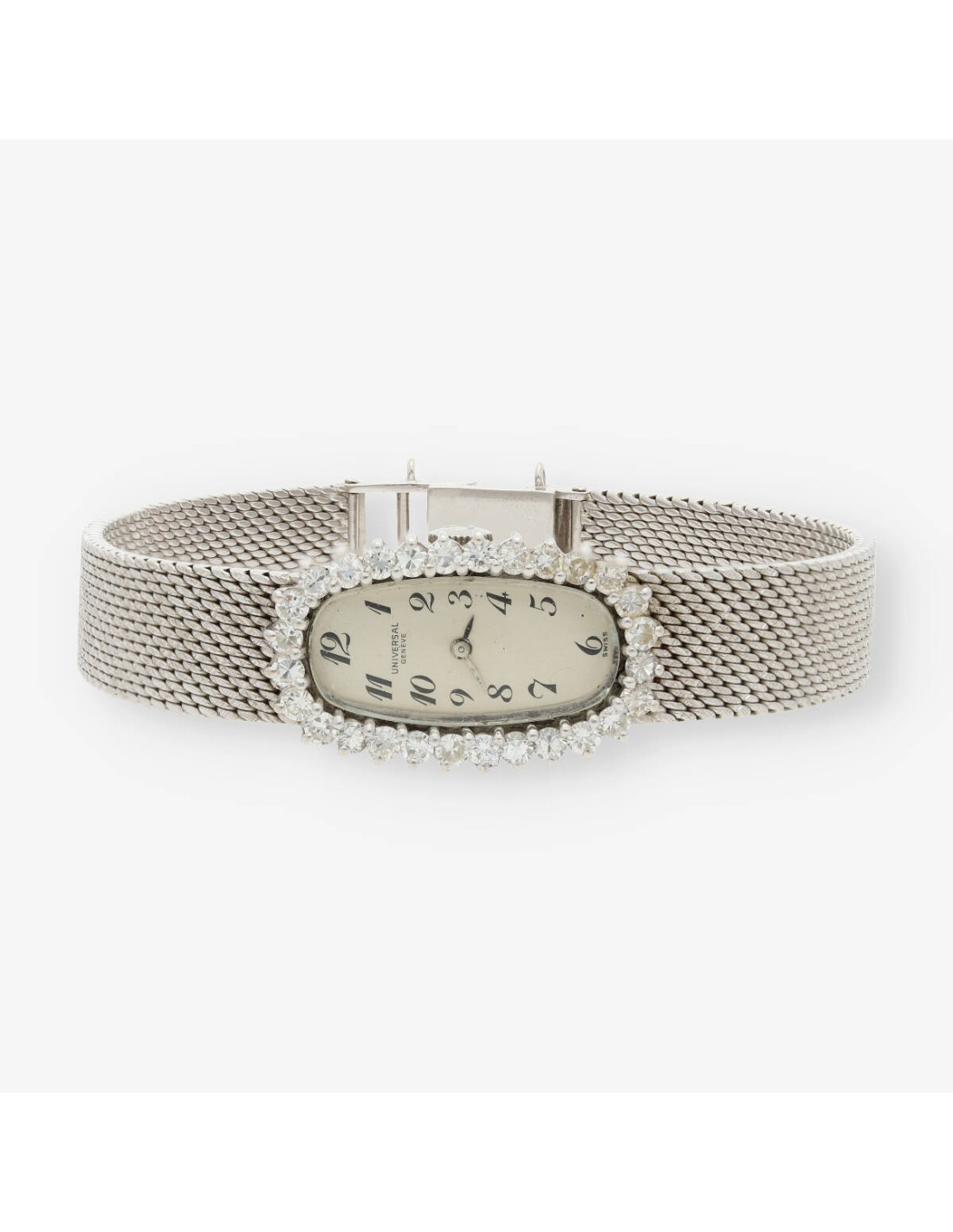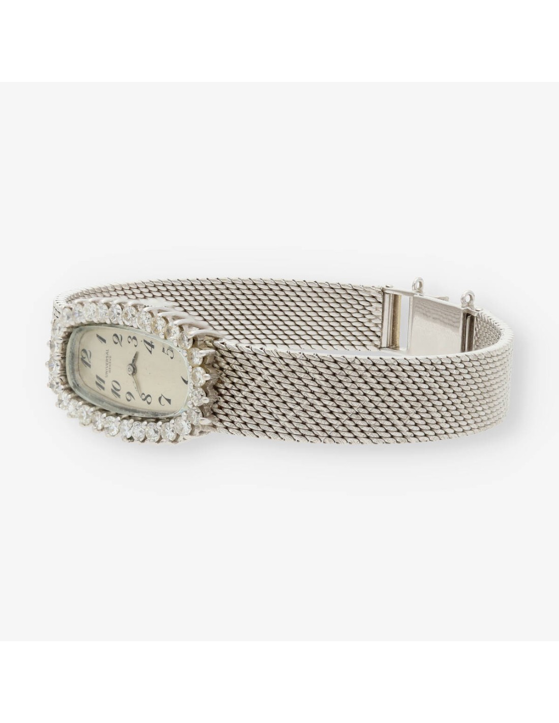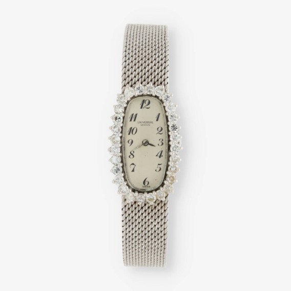Reloj Universal de segunda mano para dama en oro blanco de 18 kt. y brillantes. Mecanismo de cuerda manual. Longitud: 18cm. Peso: 42.52gr.