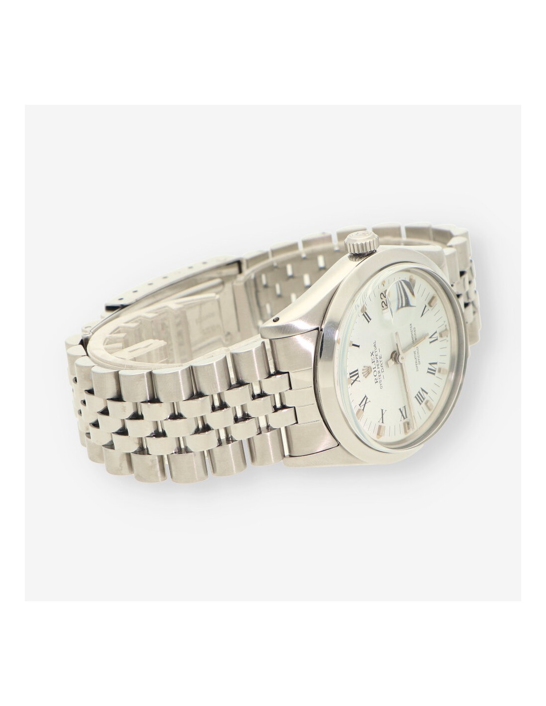 Clásico y distinguido Rolex Date con esfera blanca y números romanos, en perfecto estado de conservación.