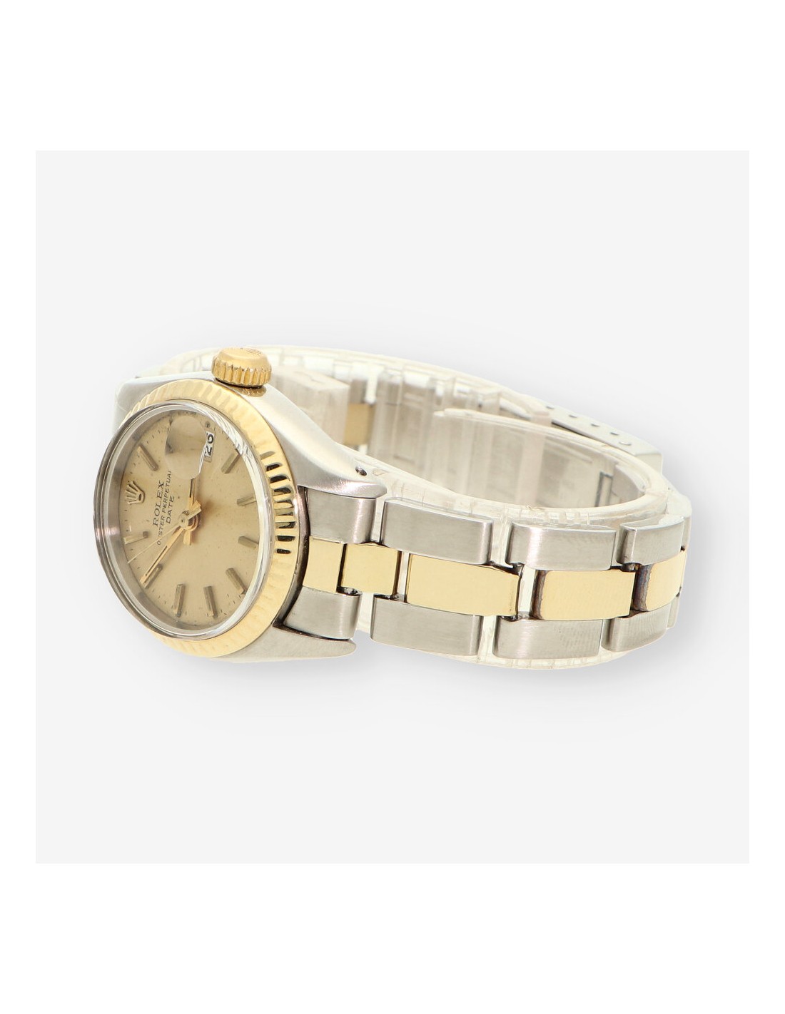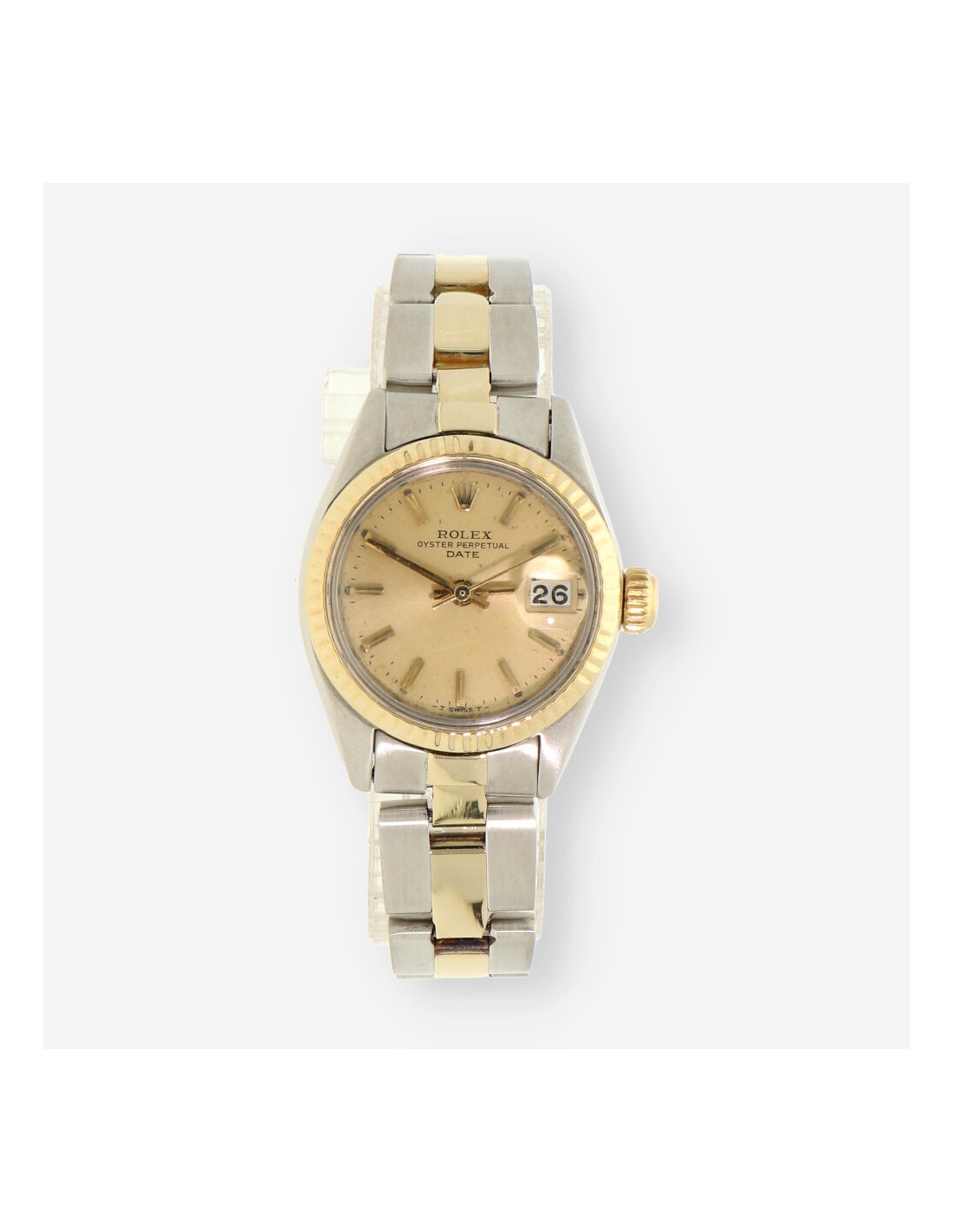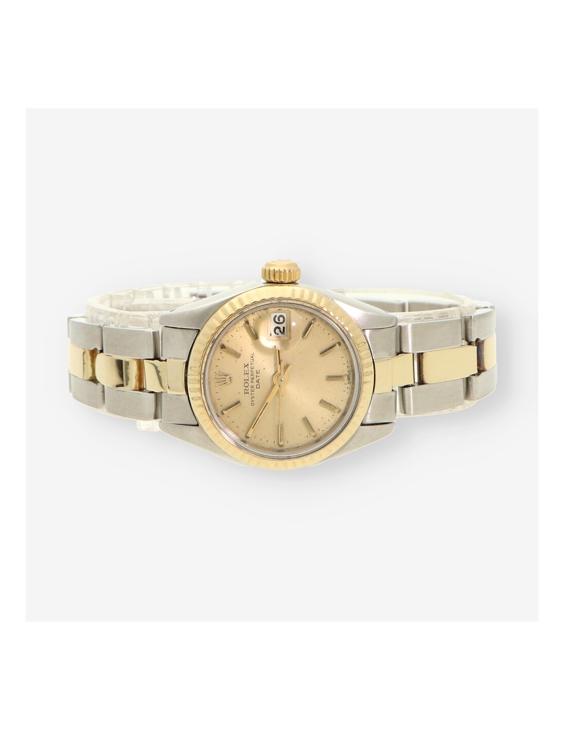 Magnífico reloj Rolex Oyster Perpetual Date de señora en perfecto estado de marcha y conservación con referencia: 6917. Cuerda automática, con una caja de 26 mm en acero y oro amarillo, cristal de plexiglás y bisel estriado. Esfera en tono dorado con marcadores de barras. Función de calendario con ventana de fecha a las 3 en punto. Resistencia al agua estándar de la serie. Brazalete en acero y oro amarillo con cierre de broche desplegable.
