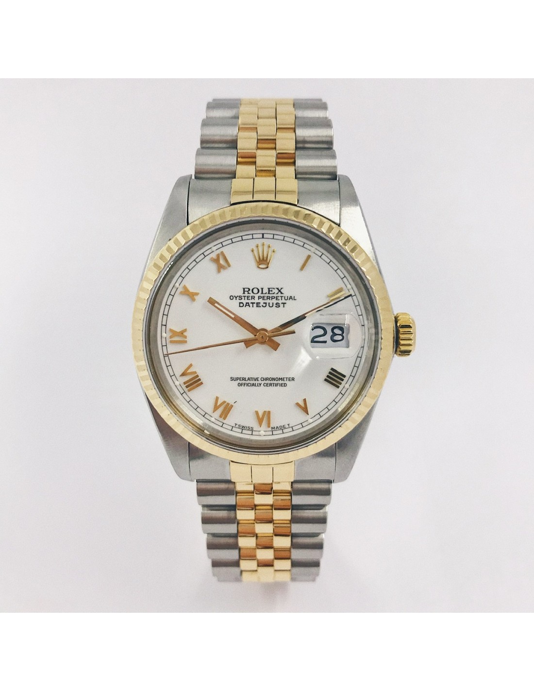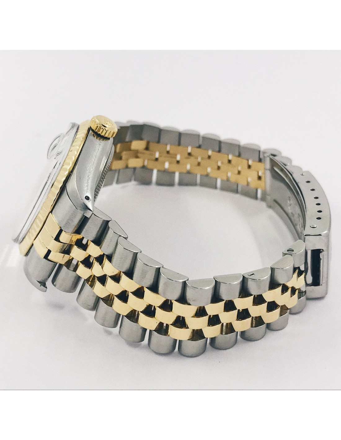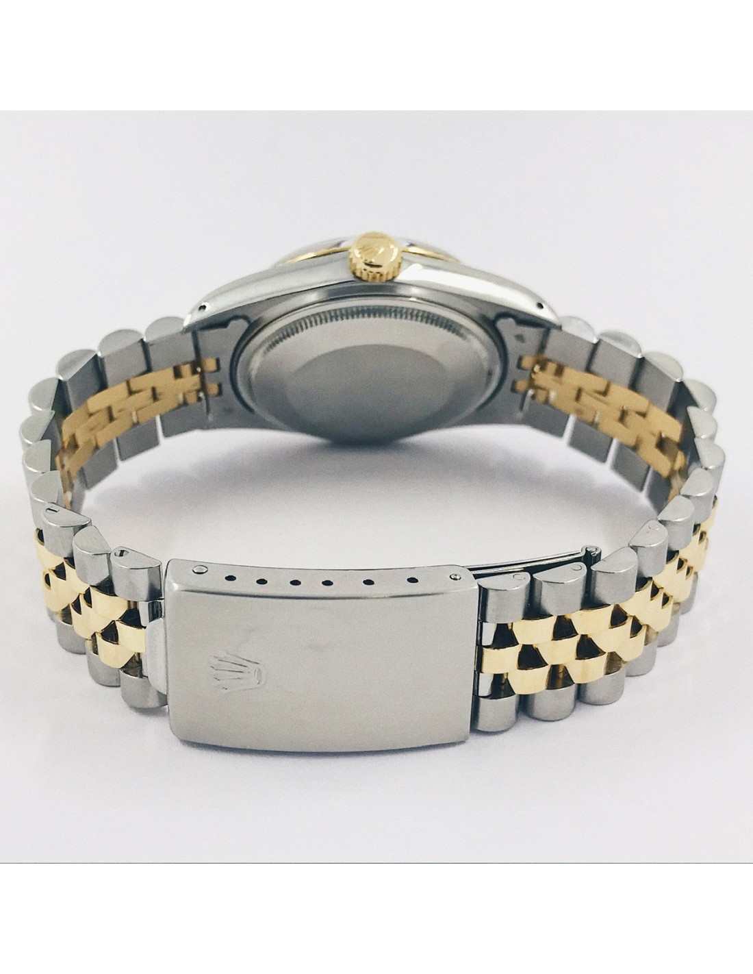 Magnifico Rolex mixto de segunda mano en perfecto estado de marcha y conservación. Ref:16013. Cuerda automática del calibre 3035 con una reserva de marchas de 42h. Caja en acero y oro 36mm con plexiglas, fondo, fondo blanco y números romanos. Resistencia al agua de 10 atmósferas. Correa en acero y oro y cierre de broche plegable en acero.