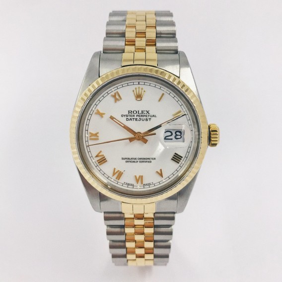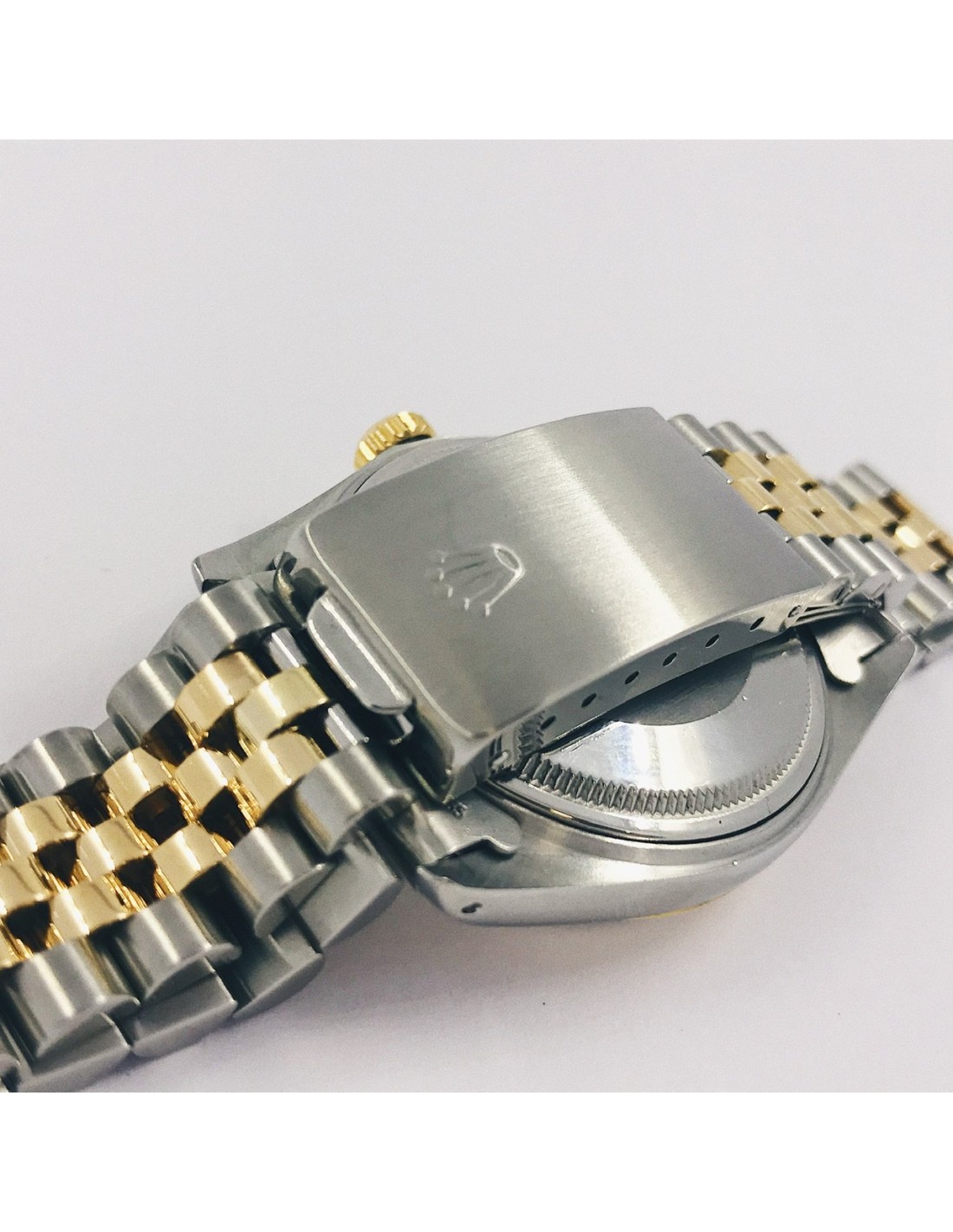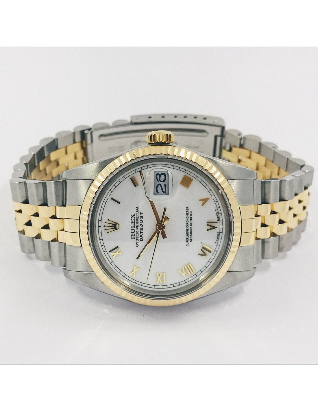 Magnifico Rolex mixto de segunda mano en perfecto estado de marcha y conservación. Ref:16013. Cuerda automática del calibre 3035 con una reserva de marchas de 42h. Caja en acero y oro 36mm con plexiglas, fondo, fondo blanco y números romanos. Resistencia al agua de 10 atmósferas. Correa en acero y oro y cierre de broche plegable en acero.