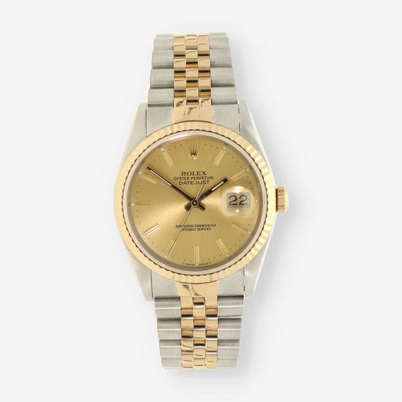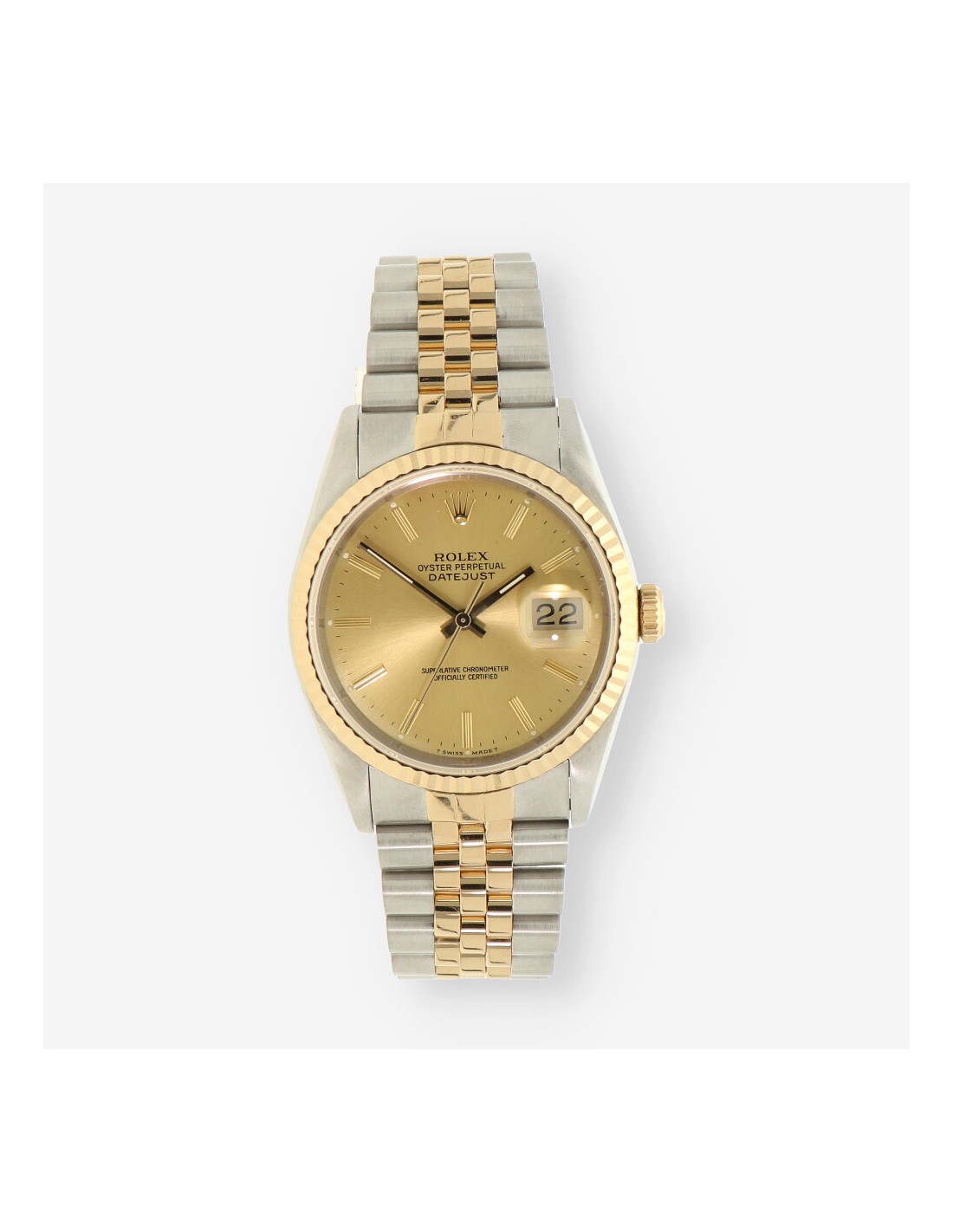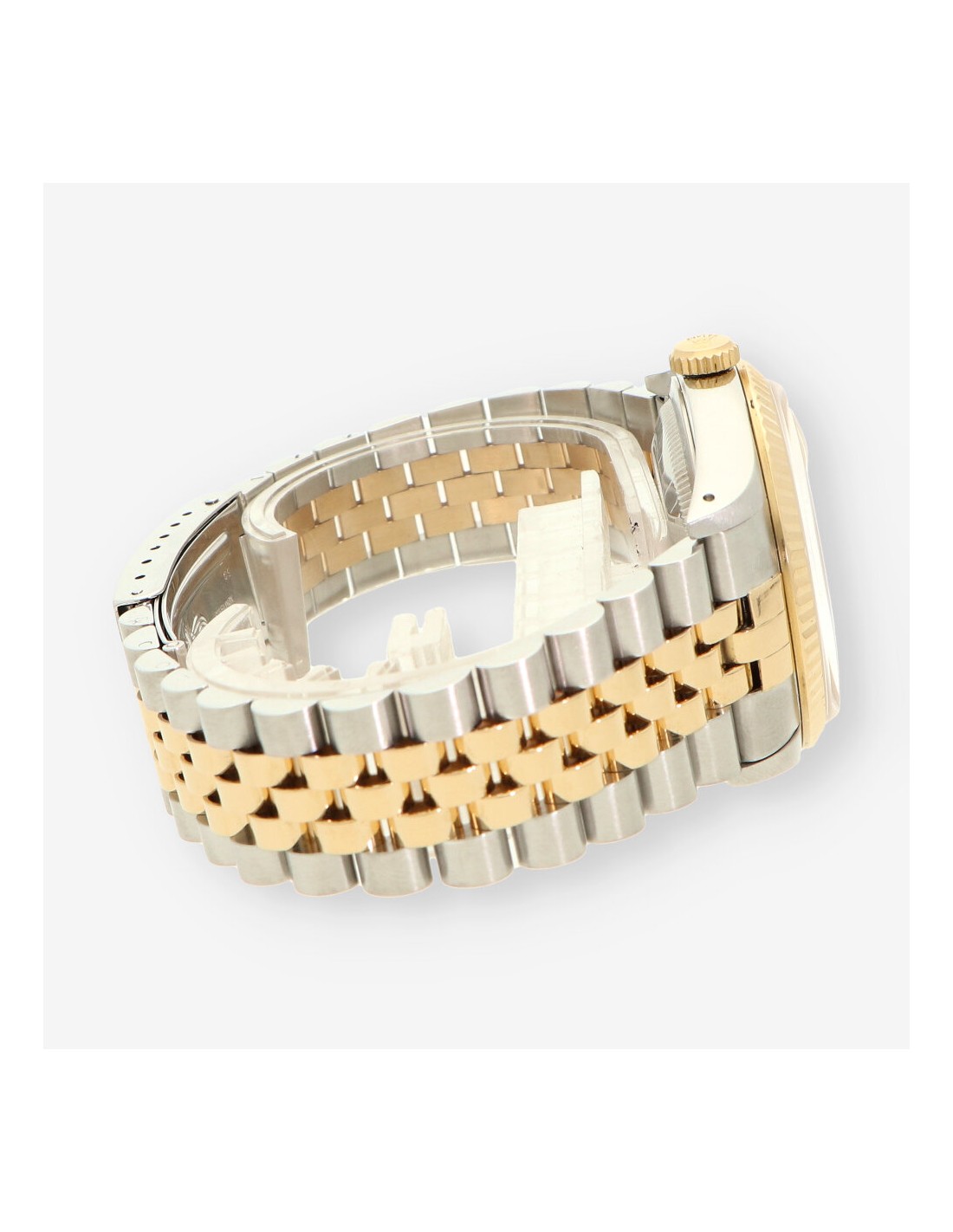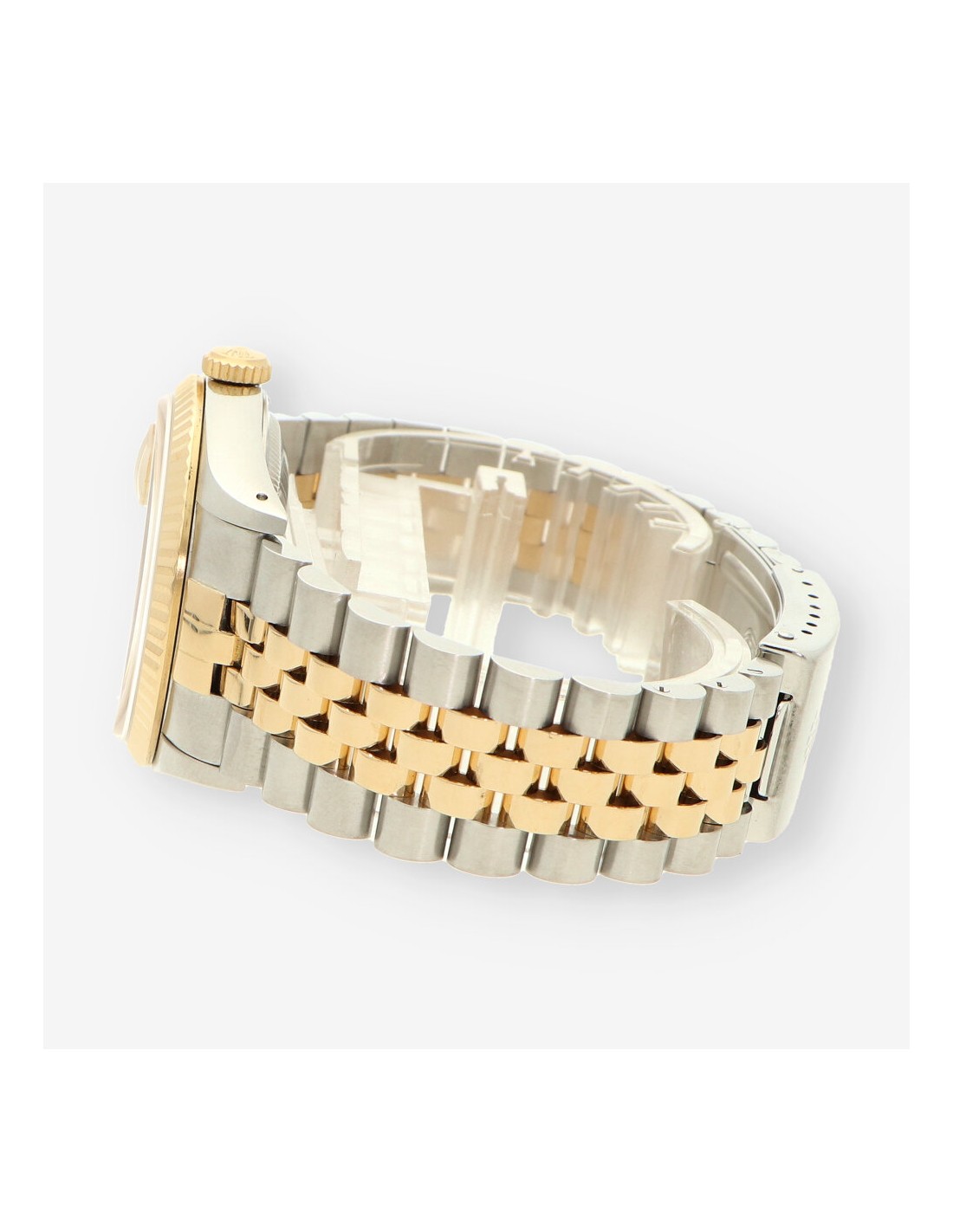 Magnifico Rolex mixto de segunda mano en perfecto estado de marcha y conservación. Ref: 16233. Cuerda automática del calibre 3135 con una reserva de marchas de 42h. Caja en acero y oro 36mm con cristal zafiro, fondo dorado y sin números. Correa en acero y oro y cierre de broche plegable en acero. Año 1990 (aprox).
