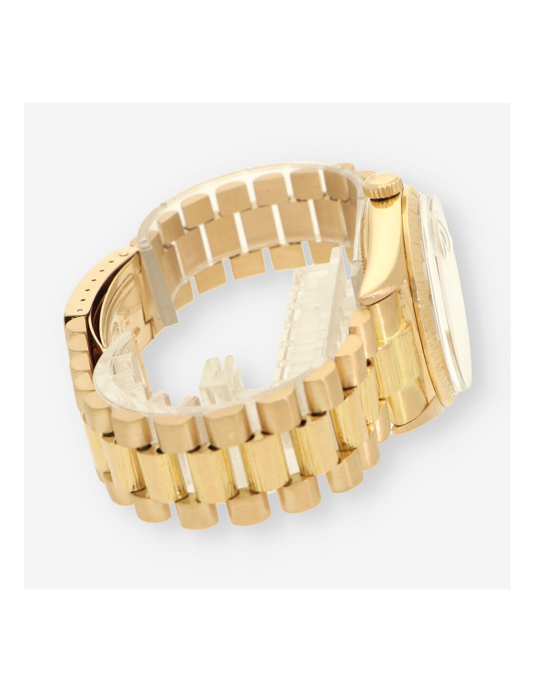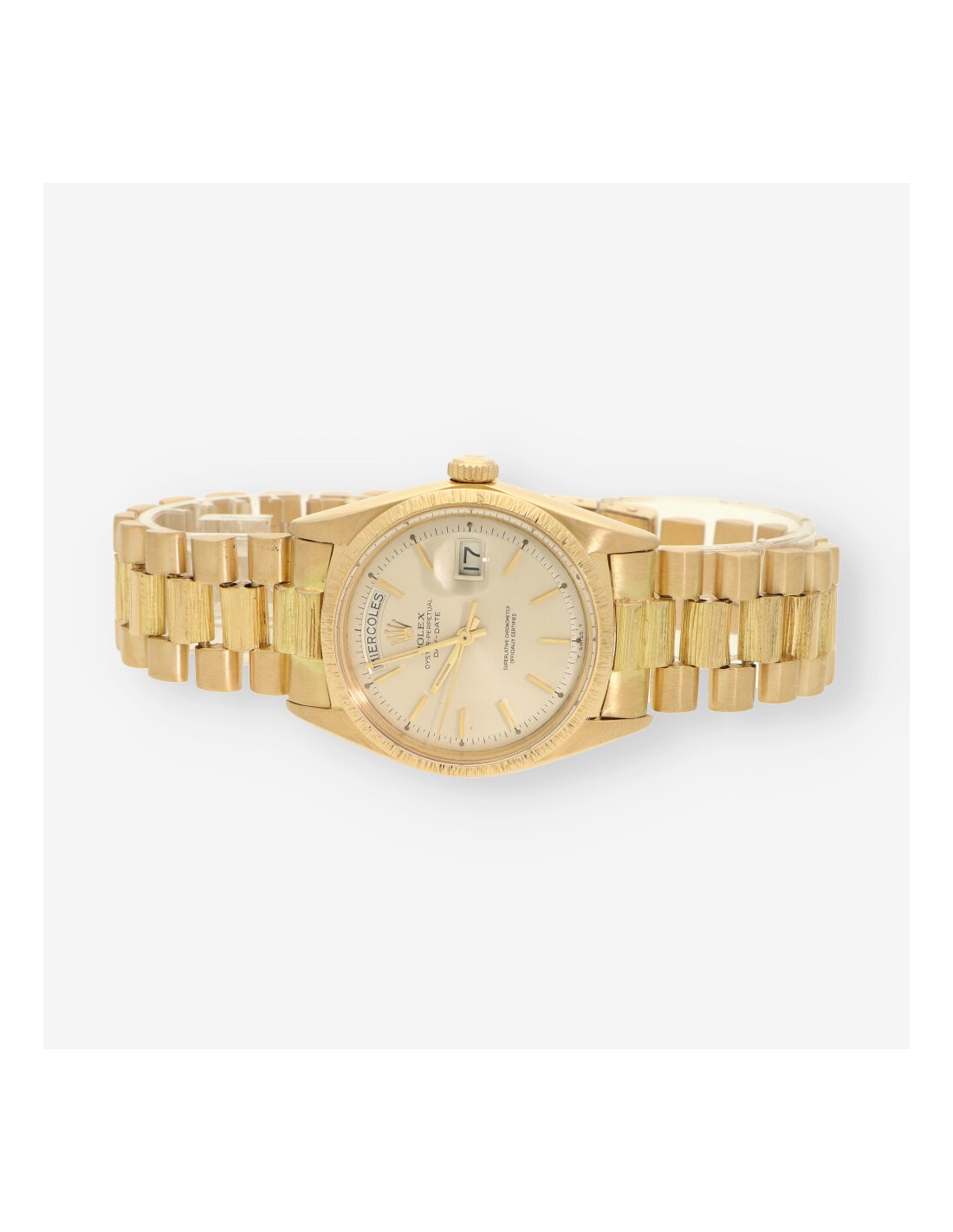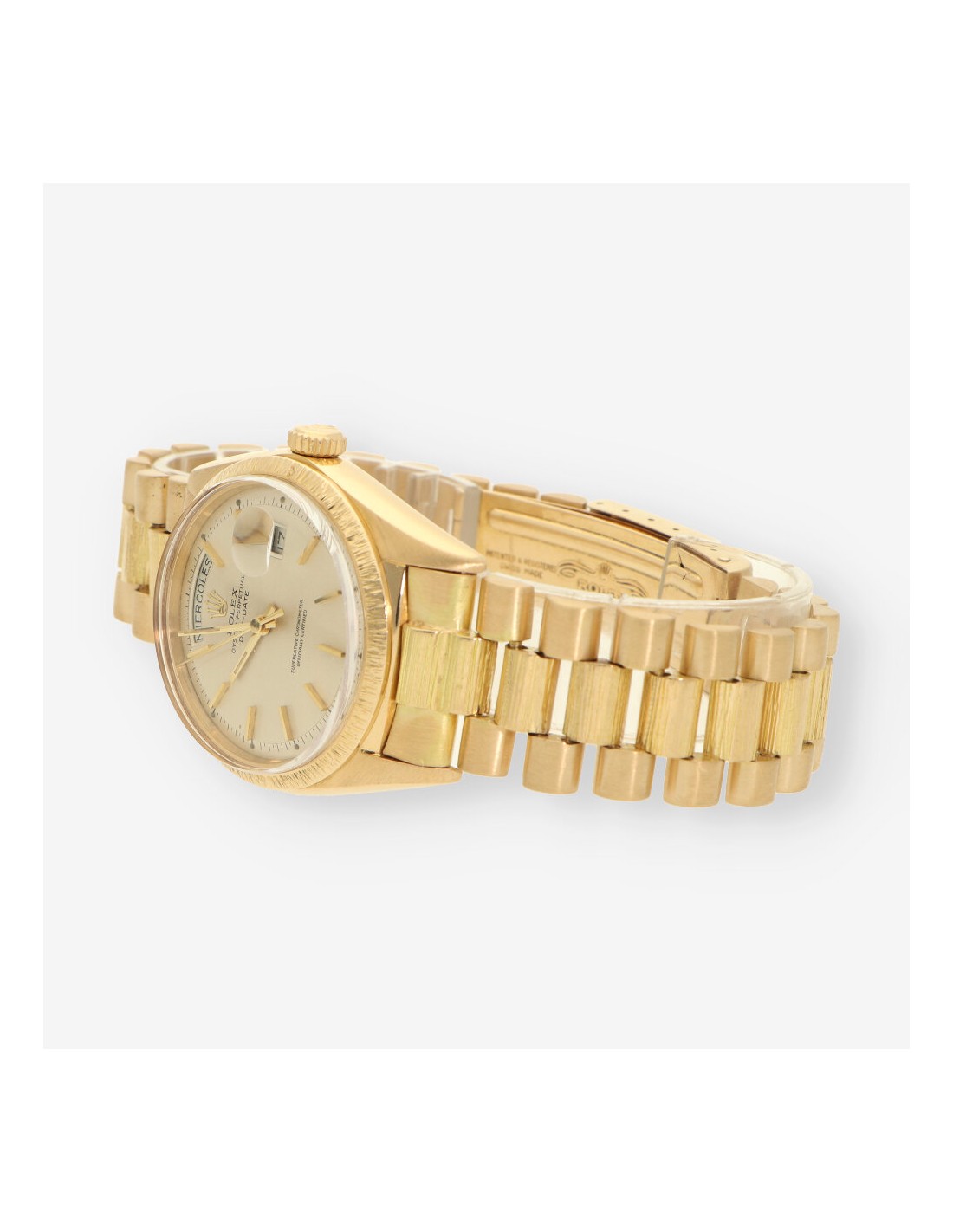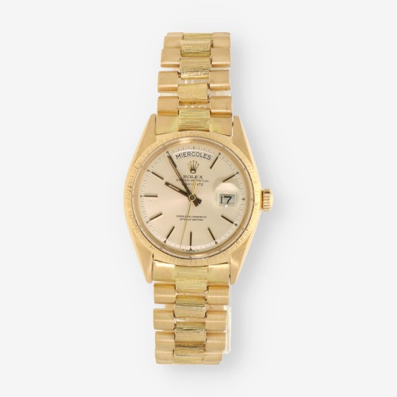 Exclusivo Rolex Day Date de 1978 en oro amarillo con acabado de corteza de madera.