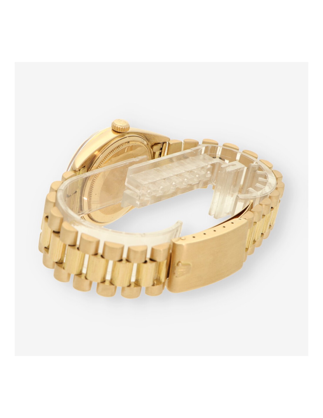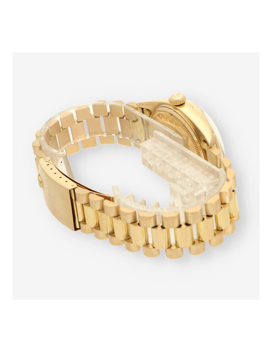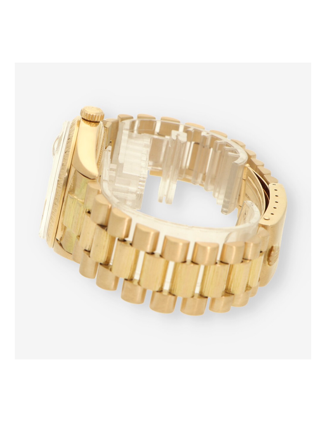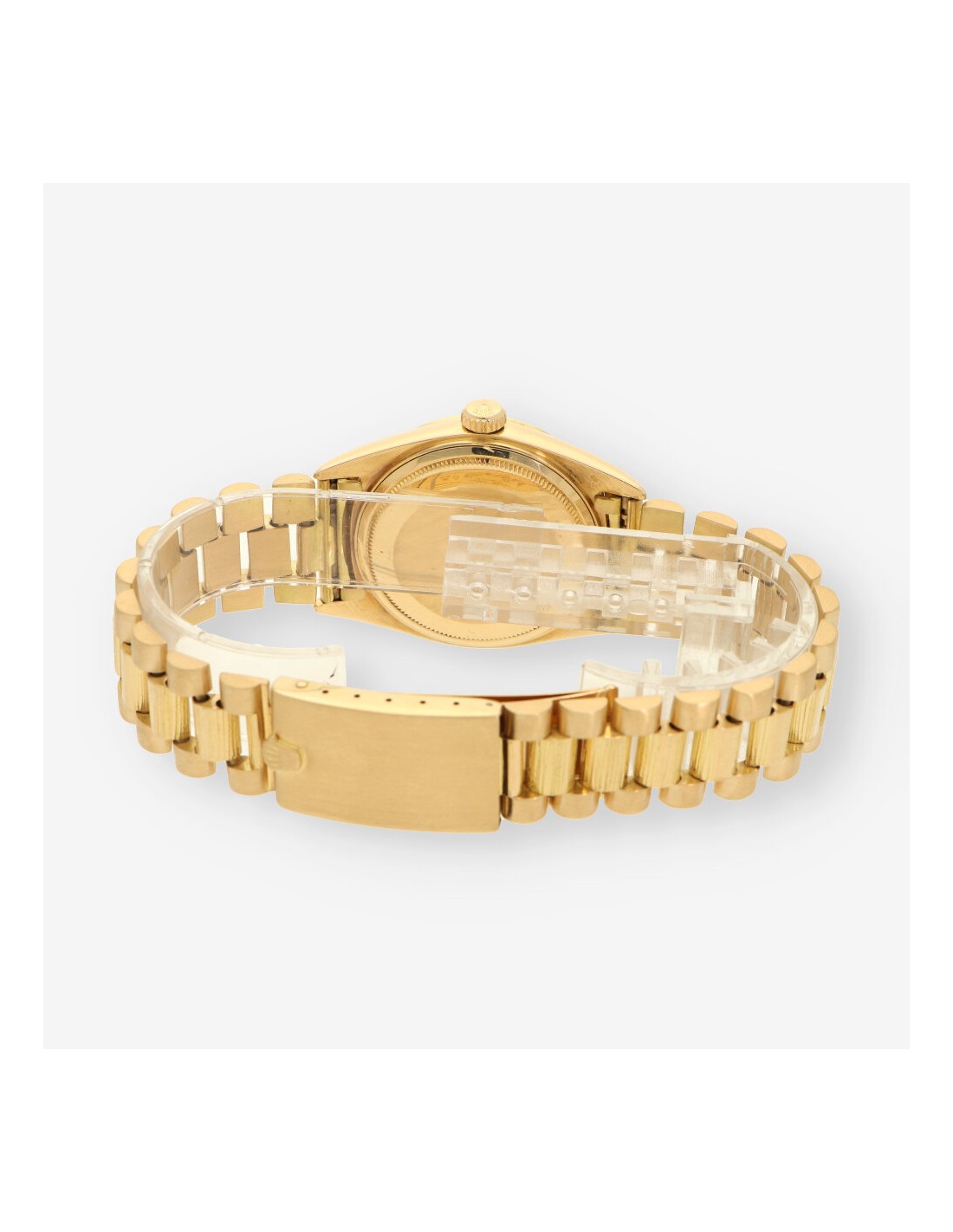 Exclusivo Rolex Day Date de 1978 en oro amarillo con acabado de corteza de madera.