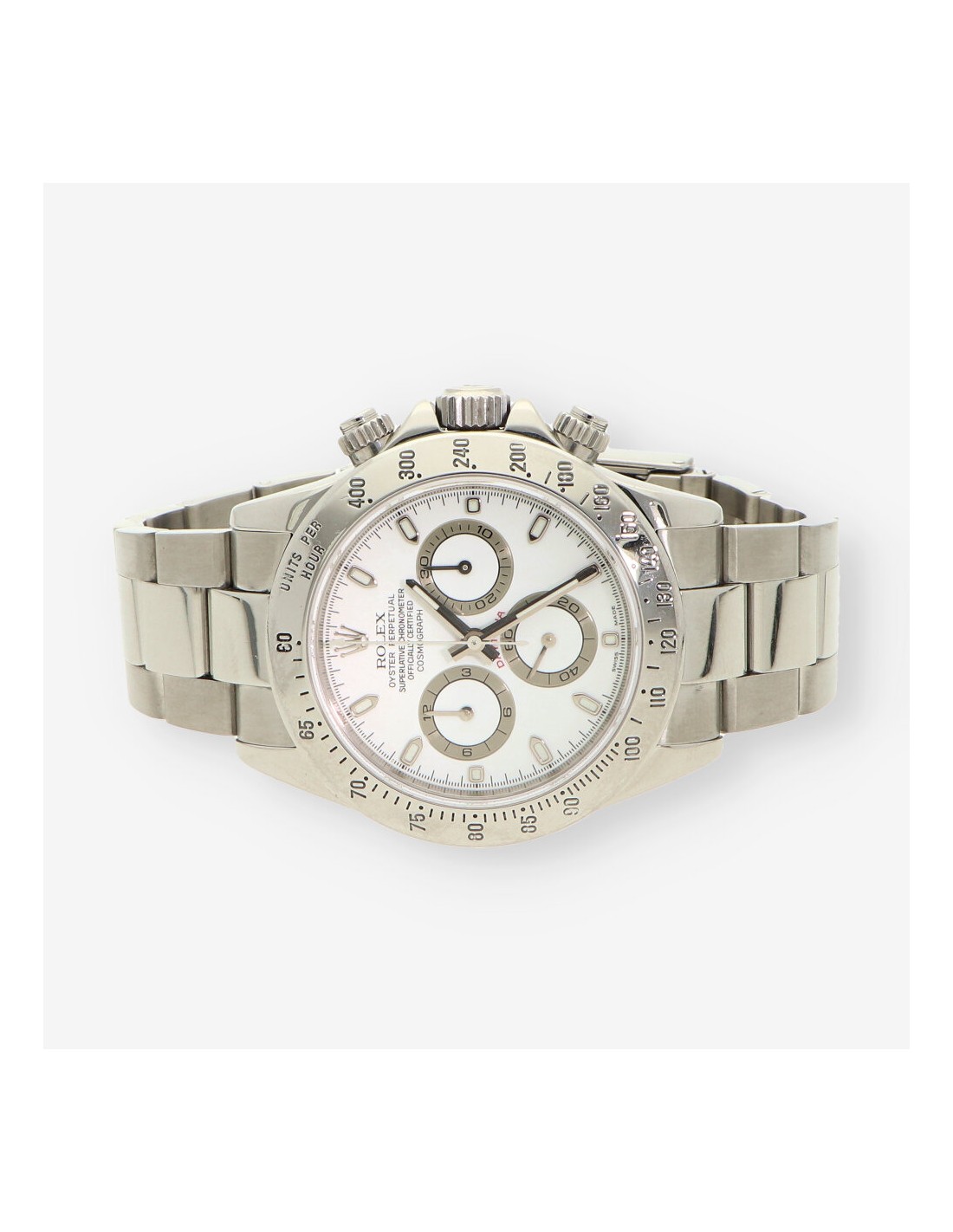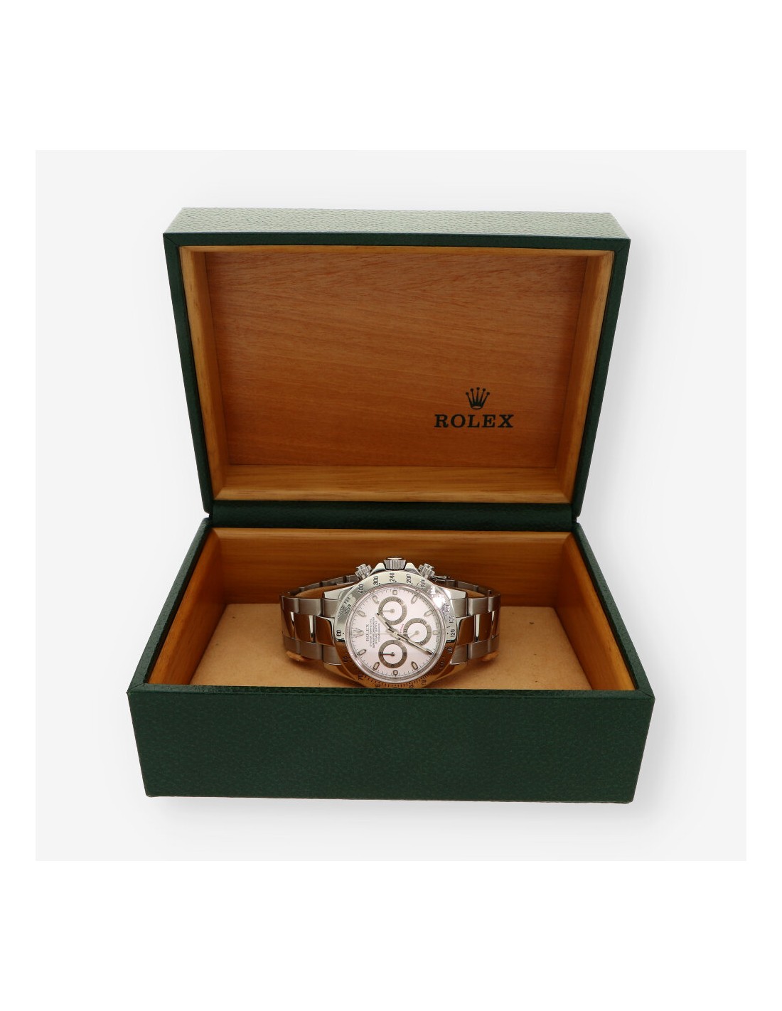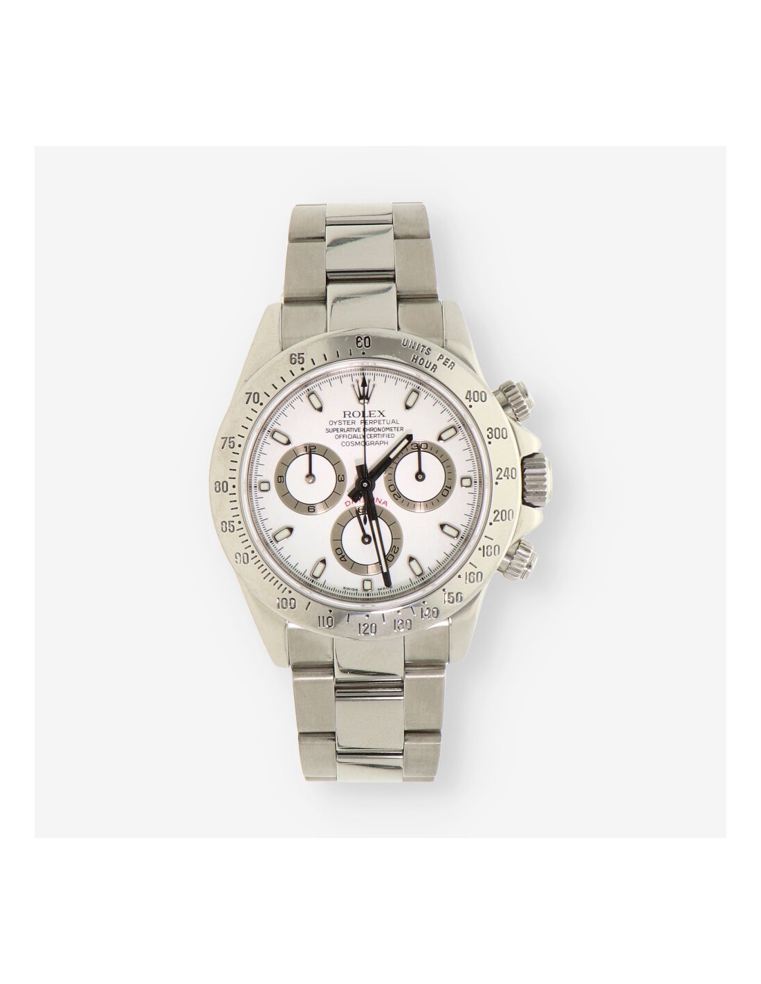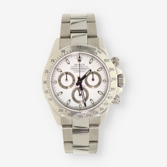 Magnífico Rolex Daytona de segunda mano en perfecto estado de marcha y conservación, referencia: 116520 del año 2006. Caja de acero con fondo roscado, corona y pulsadores atornillados, bisel fijo con escala taquímetra, cristal zafiro. Esfera blanca con aguas e índices luminiscentes sin cifras. Mecanismo automático del calibre 4130 con una reserva de marchas de 72 horas y 44 joyas en su interior. Correa oyster en acero con cierre desplegable. Diámetro 40mm. Con caja y documento.