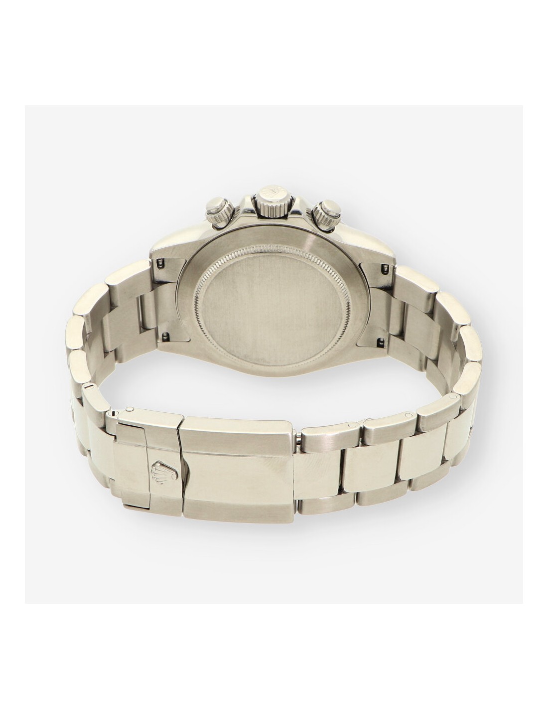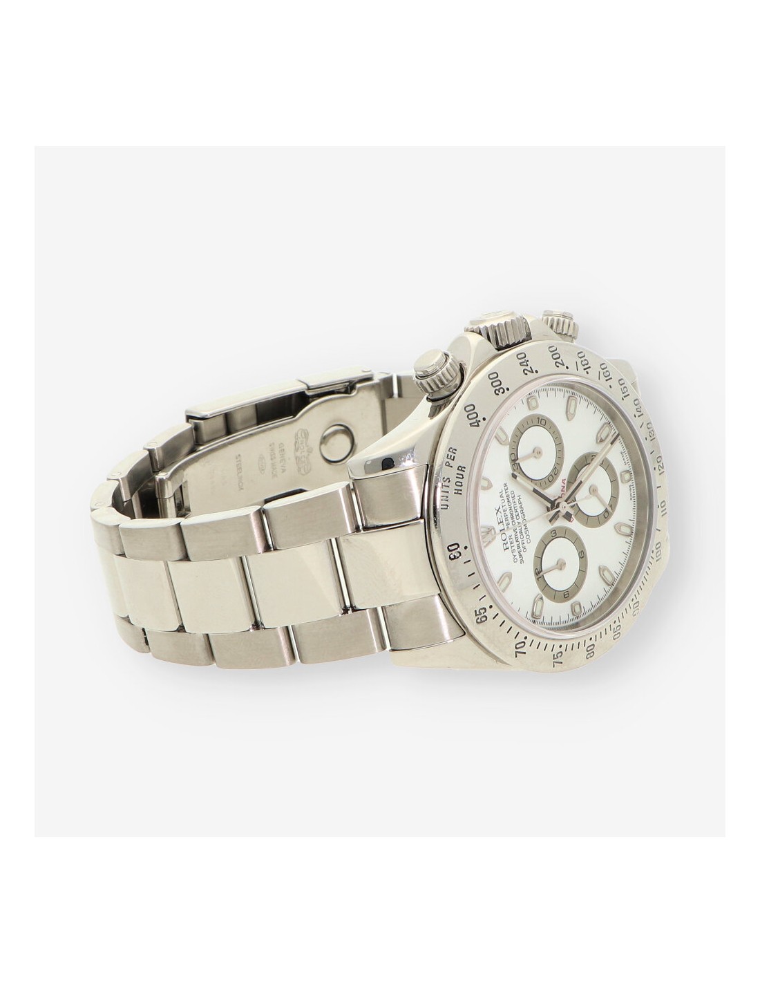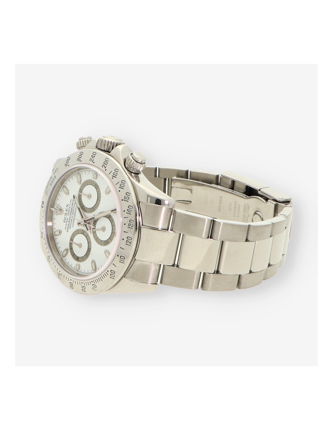 Magnífico Rolex Daytona de segunda mano en perfecto estado de marcha y conservación, referencia: 116520 del año 2006. Caja de acero con fondo roscado, corona y pulsadores atornillados, bisel fijo con escala taquímetra, cristal zafiro. Esfera blanca con aguas e índices luminiscentes sin cifras. Mecanismo automático del calibre 4130 con una reserva de marchas de 72 horas y 44 joyas en su interior. Correa oyster en acero con cierre desplegable. Diámetro 40mm. Con caja y documento.