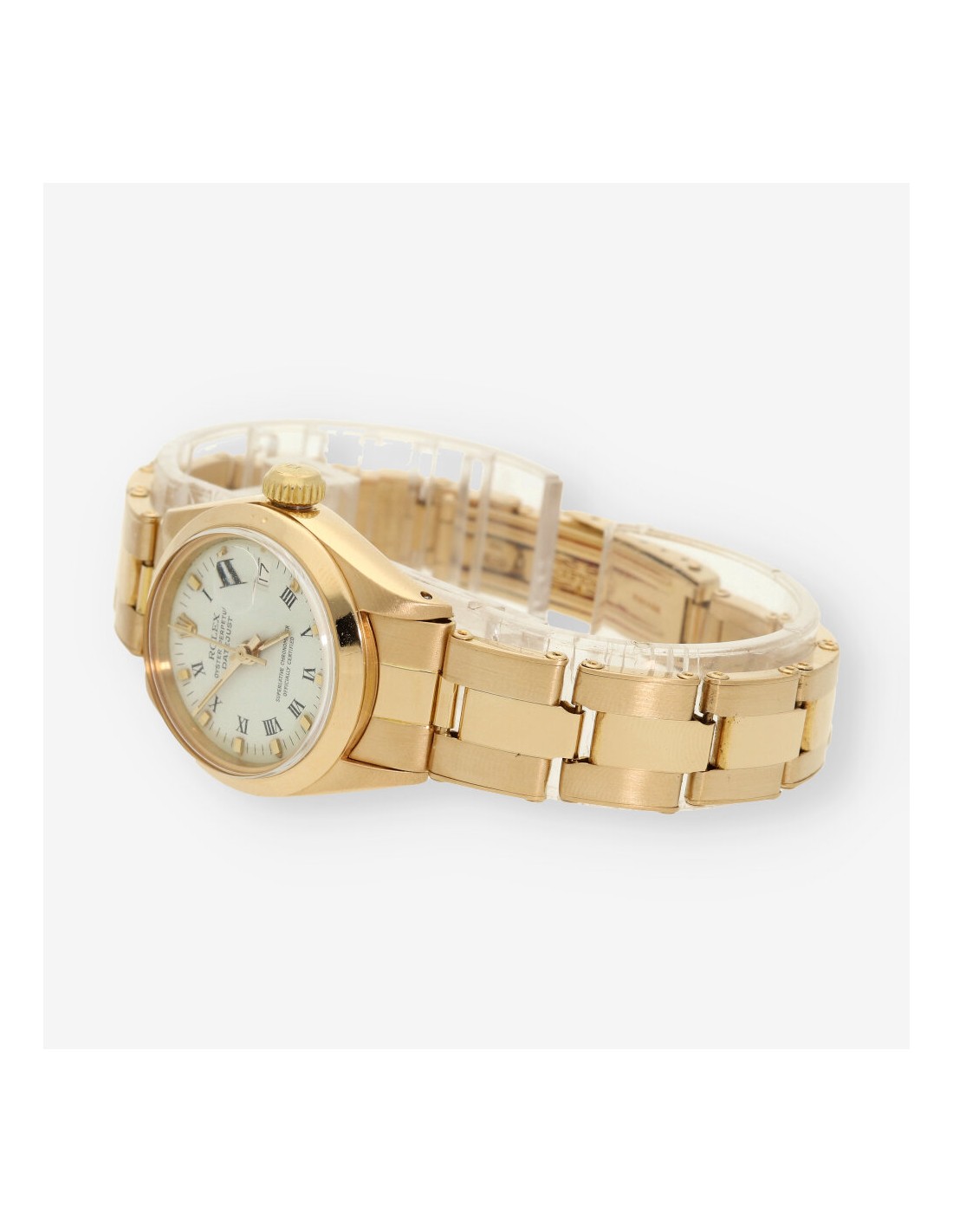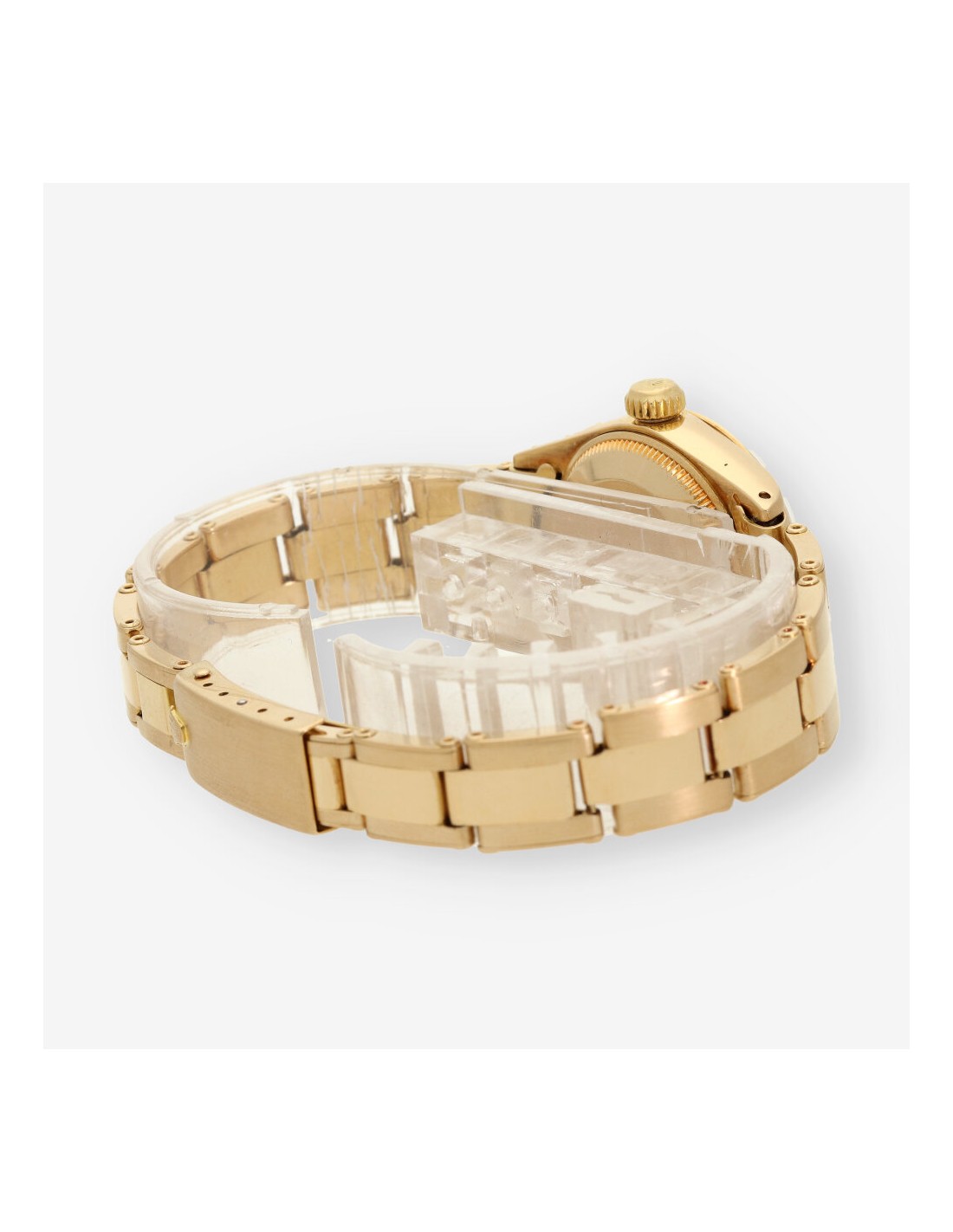 Magnifico rolex Lady Datejust de segunda mano en perfecto estado de marcha y conservación con referencia: 6916. Cuerda automática. Caja de 26mm en oro, cristal plexiglas fondo blanco con númros romanos. Correa con cierre de broche plegable en oro. Año 1974 aprox.