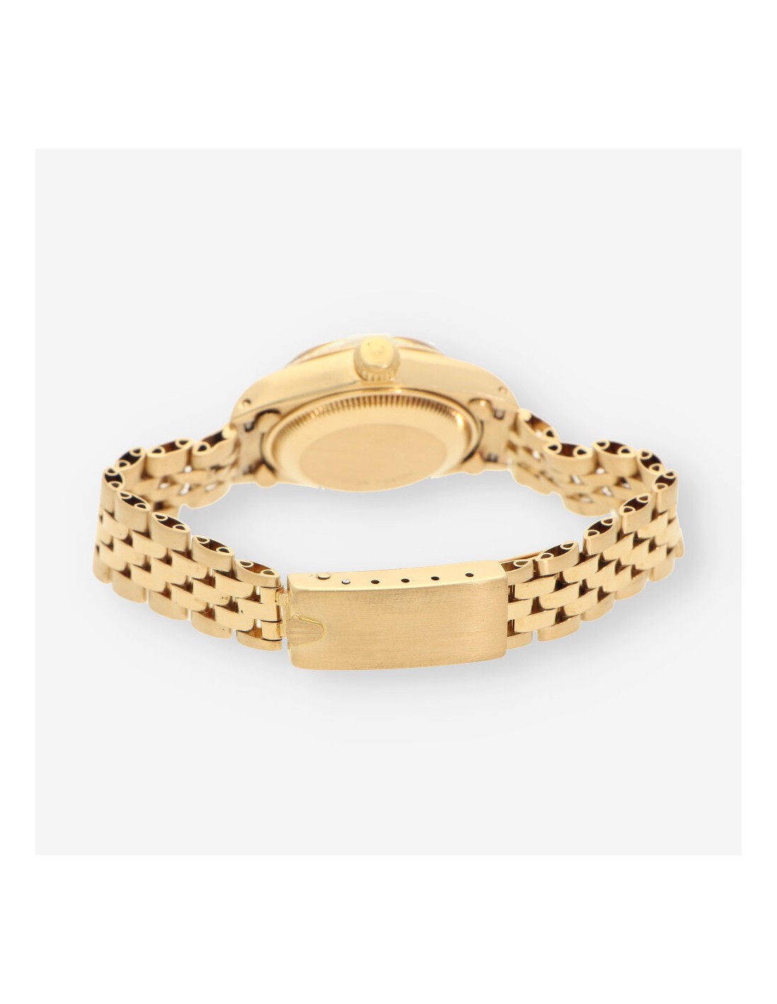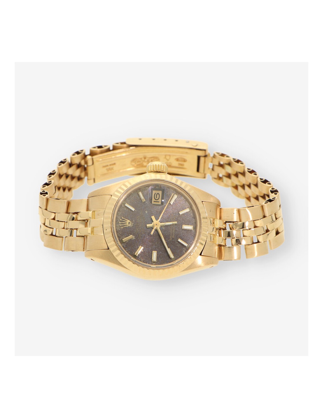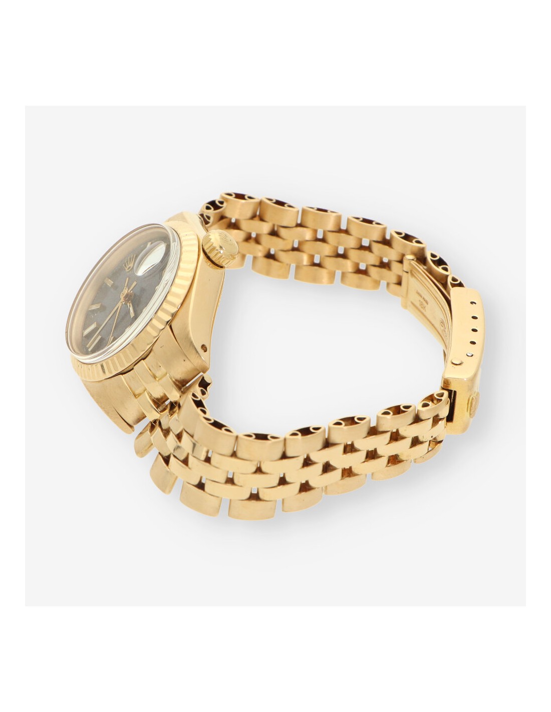 Magnifico Rolex Lady Datejust de segunda mano en perfecto estado de marcha y conservación con referencia: 6917. Cuerda automática con una reserva de marchas de 42 horas. Caja de 26mm en oro Cristal plexiglás fondo negro sin cifras y resistencia al agua de 10 atmósferas. Correa en oro con cierre de broche plegable en oro. Año 1980 aproximado.