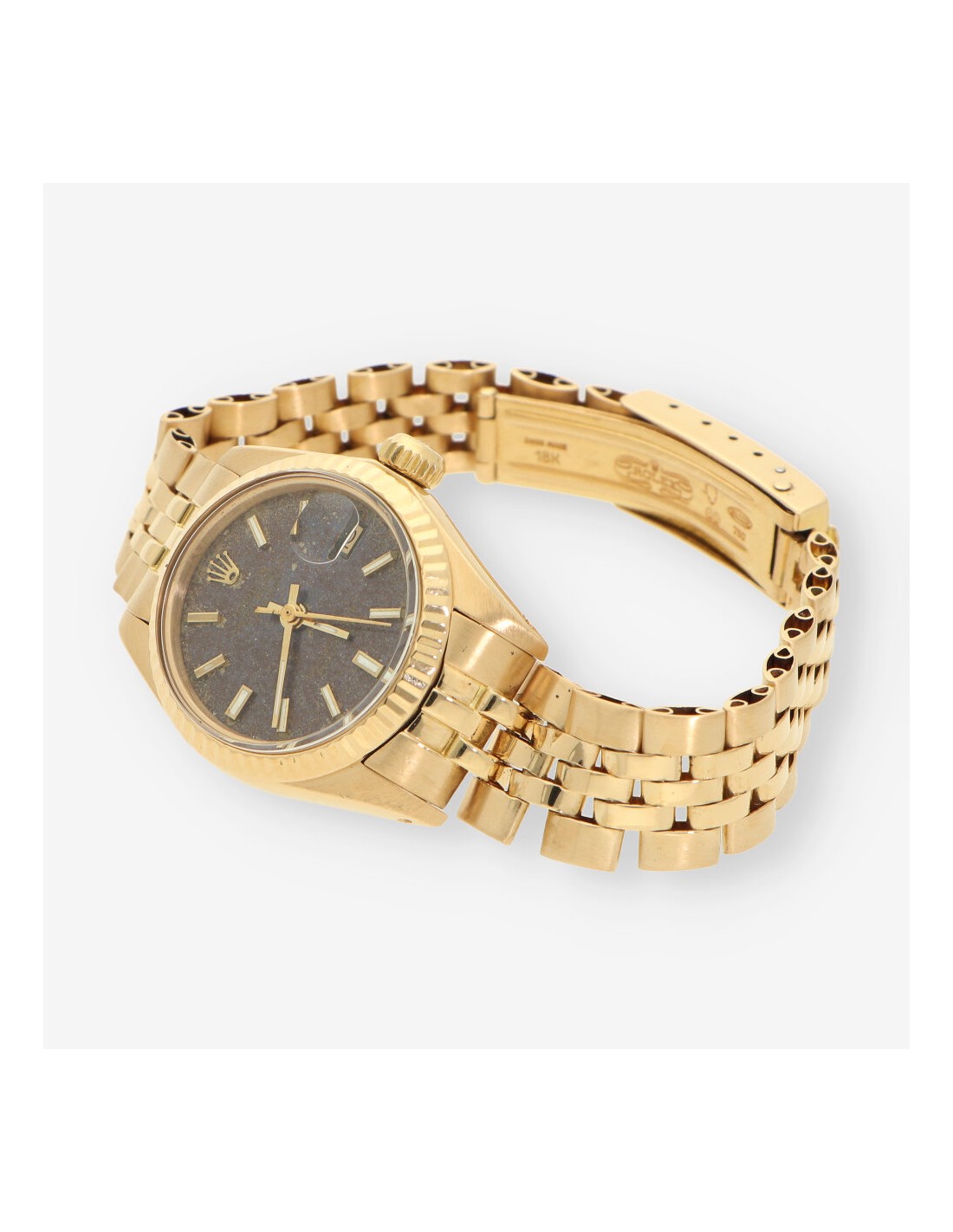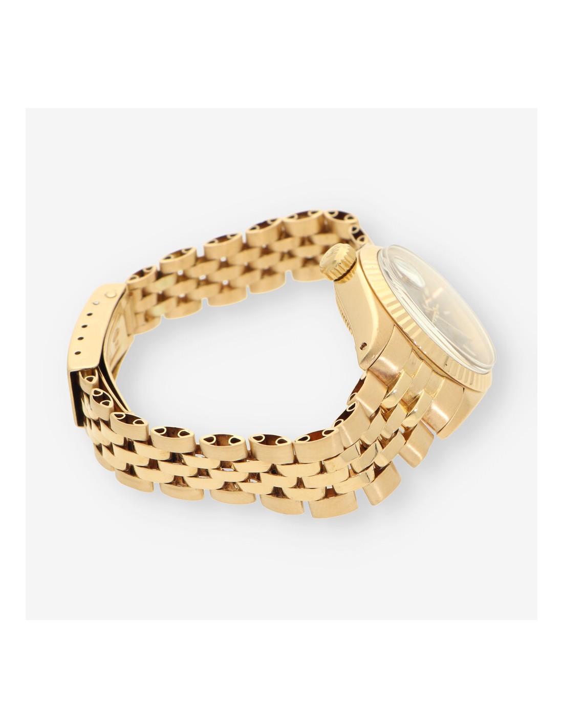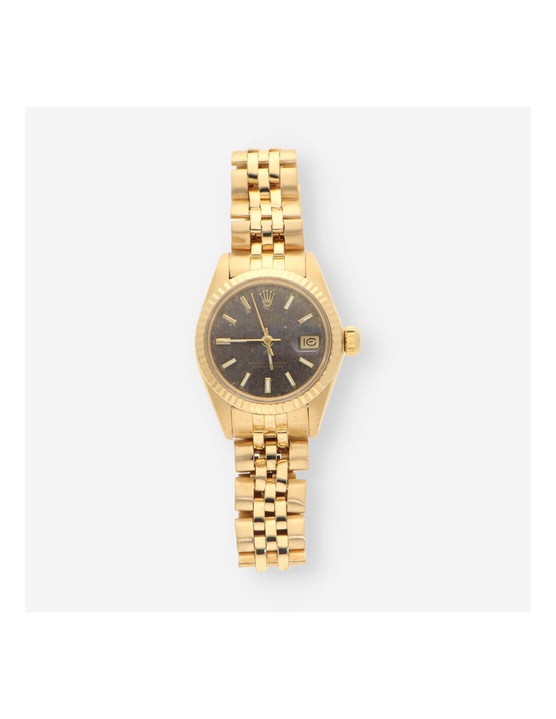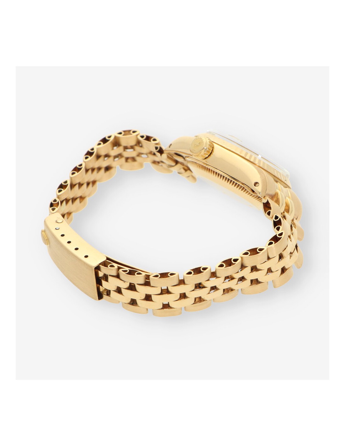 Magnifico Rolex Lady Datejust de segunda mano en perfecto estado de marcha y conservación con referencia: 6917. Cuerda automática con una reserva de marchas de 42 horas. Caja de 26mm en oro Cristal plexiglás fondo negro sin cifras y resistencia al agua de 10 atmósferas. Correa en oro con cierre de broche plegable en oro. Año 1980 aproximado.