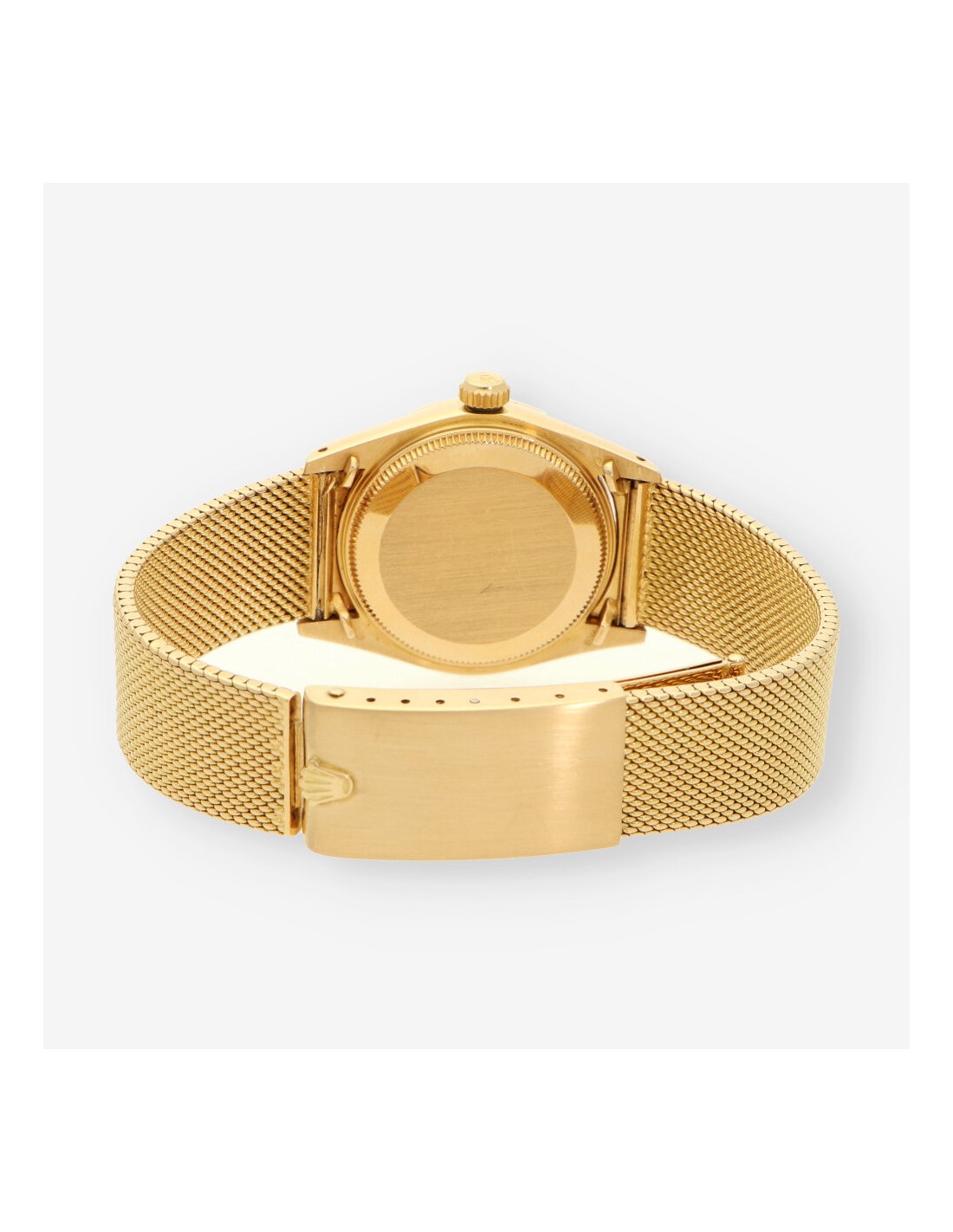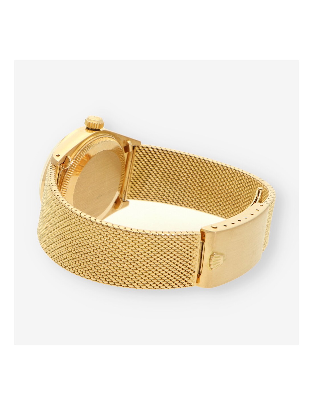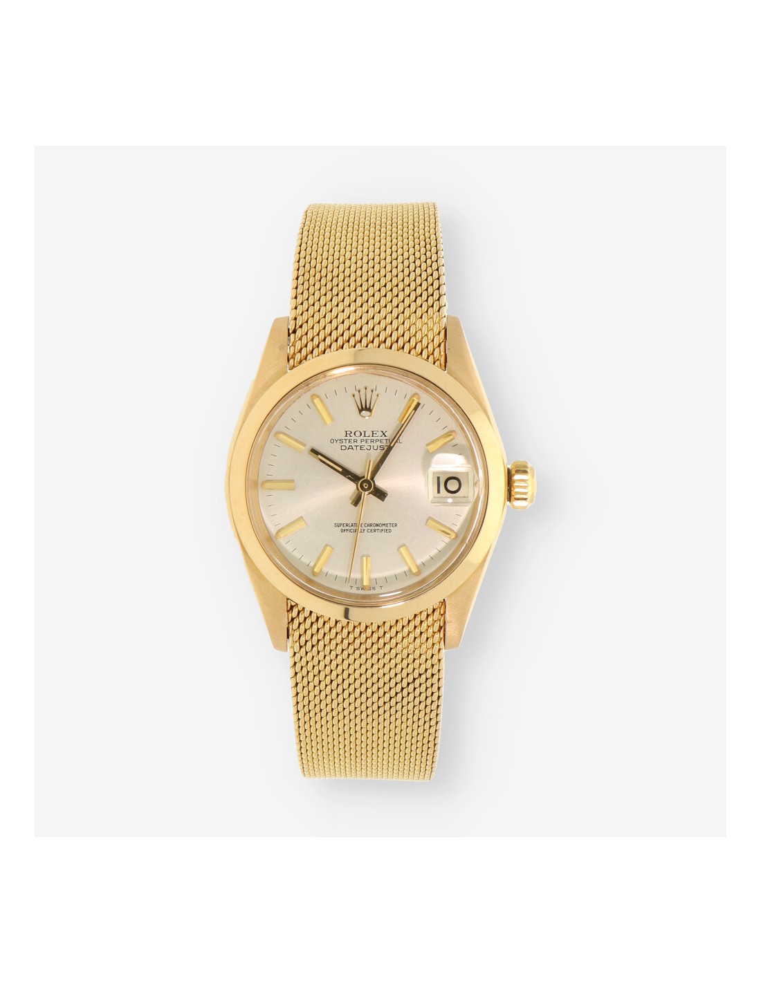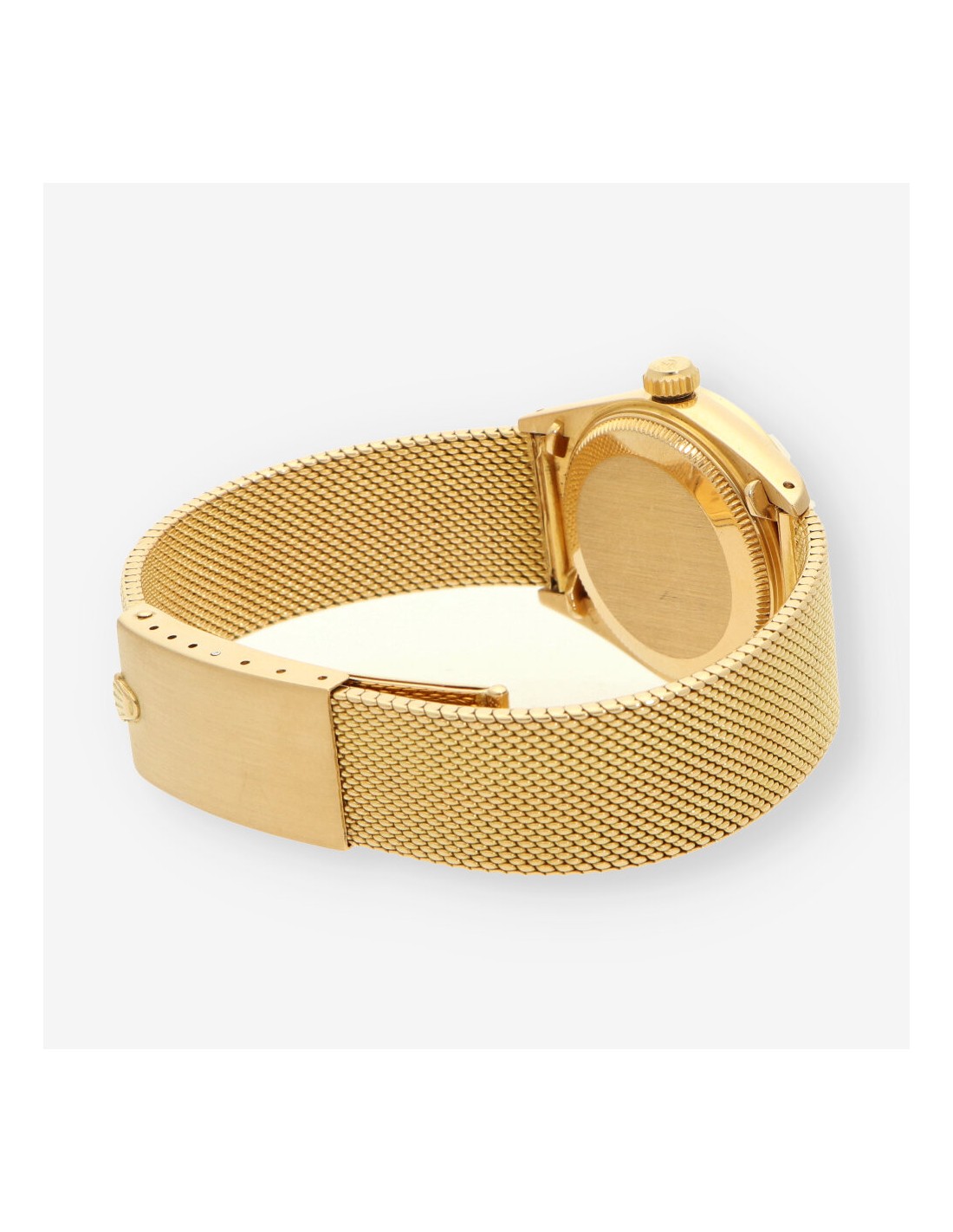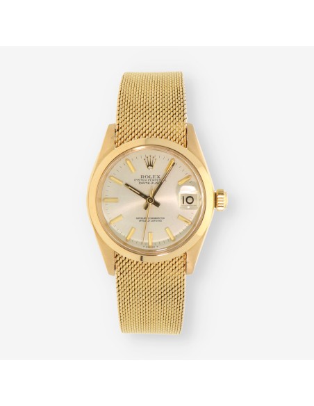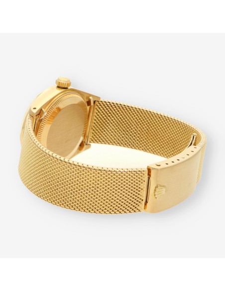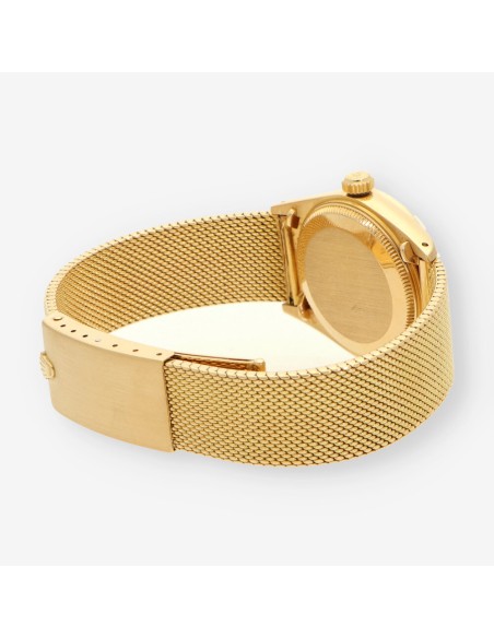 Rolex Lady Datejust ref. 6824 en oro amarillo de 18kt. Reloj automático con calibre Rolex 2030, reserva de marcha de 48 horas y 28 rubíes. Caja de 31 mm de diámetro en oro amarillo con cristal Plexiglas y bisel liso del mismo material. Esfera dorada sin cifras, con un diseño elegante y limpio. Hermeticidad garantizada hasta 10 ATM. Una pieza clásica y refinada, perfecta para quienes buscan distinción y tradición en un tamaño femenino. Año 1977 aprox.