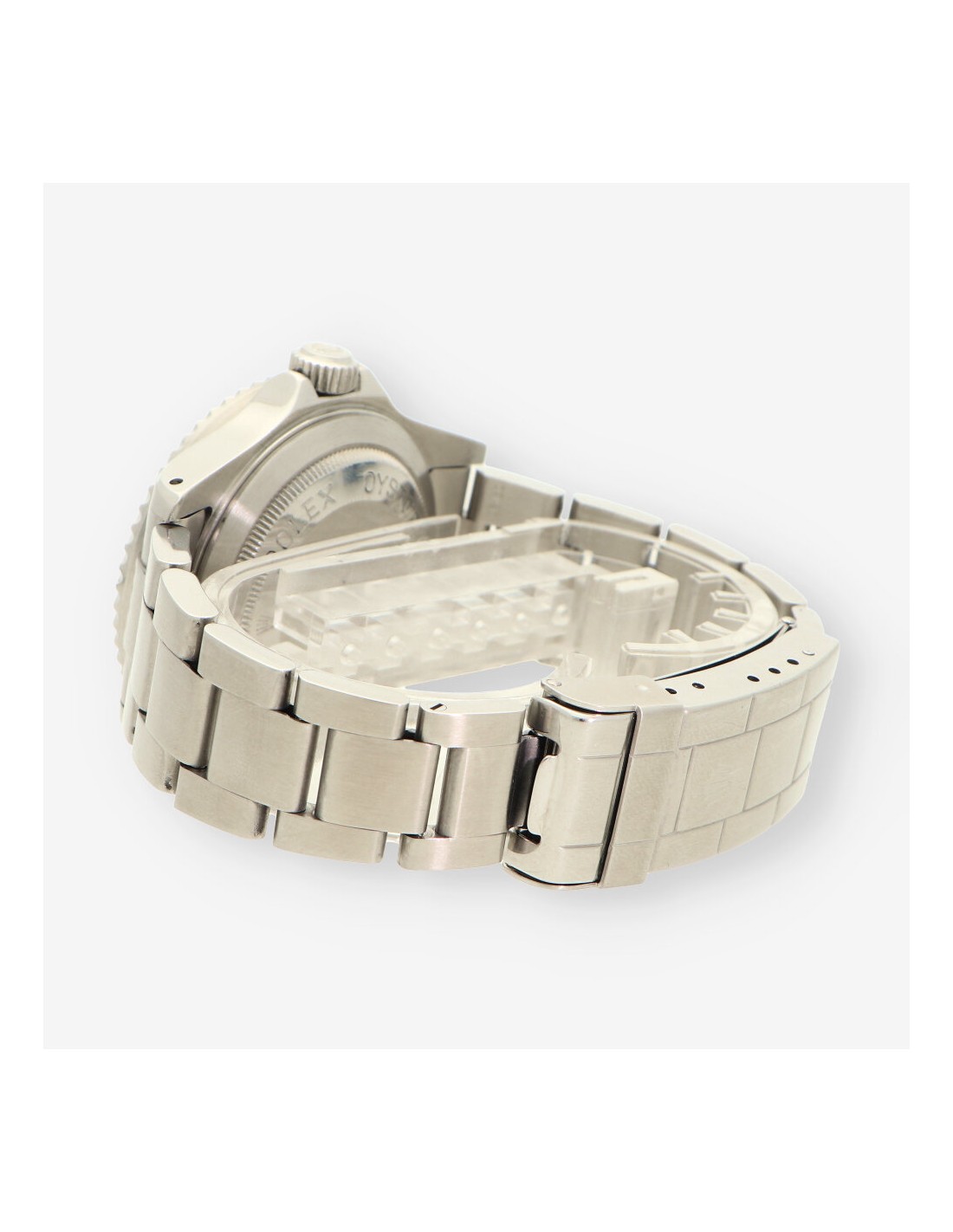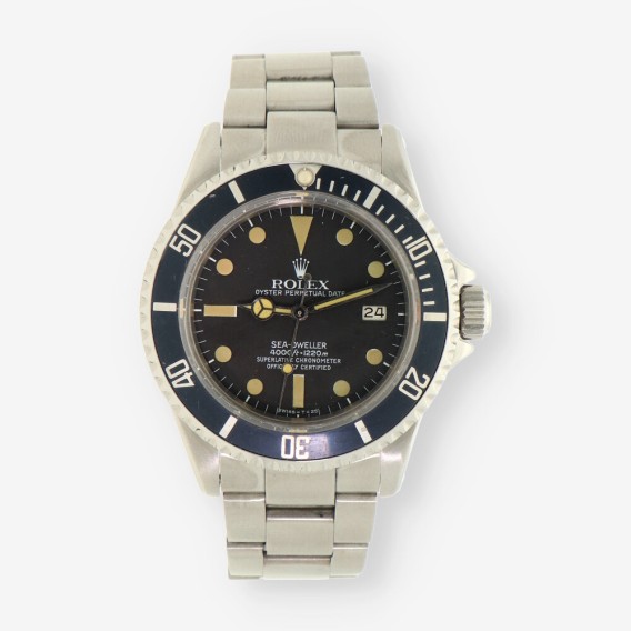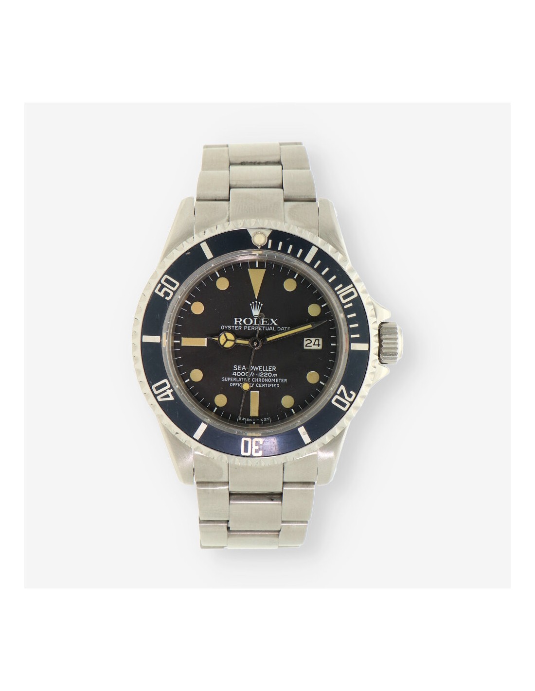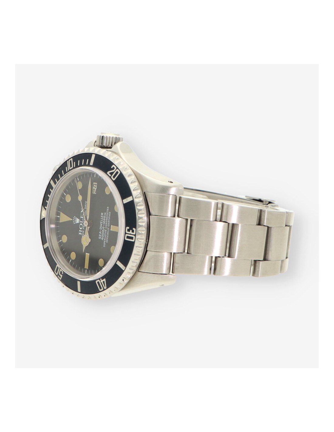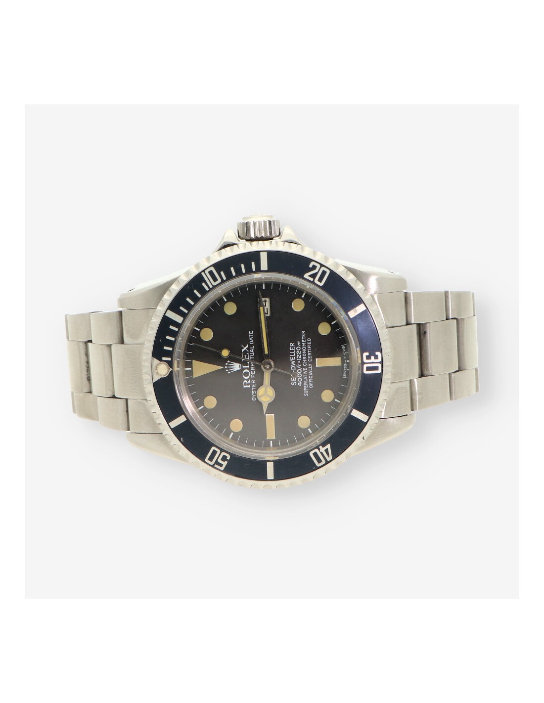 Magnífico Rolex Sea-Dweller date de segunda mano en perfecto estado de marcha y conservación. Ref: 16660 del año 1981 (aprox), con cuerda automática. Caja de 40mm en acero con cristal zafiro, fondo negro sin cifras, con una reserva de marcha de 48 horas y resistencia al agua de 120 atmósferas. Correa y cierre en acero.