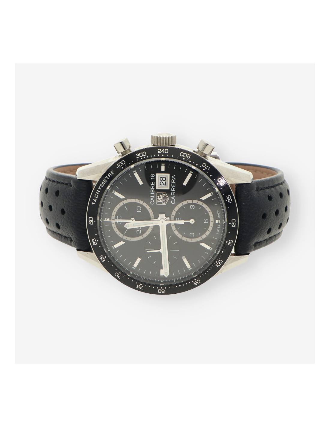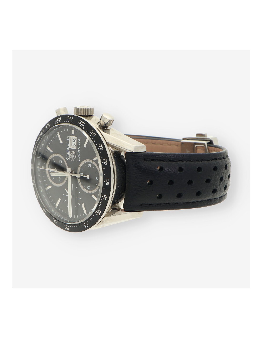 Precioso TAG HEUER Carrera del calibre 16 de segunda mano en perfecto estado de marcha y conservación. Cuerda automática. Caja en acero 41mm con cristal zafiro fondo en negro y sin cifras. Segundero a las 9, minutero del cronógrafo a las 12 y a las 6 está situado el horario del cronografo. Resistencia al agua de 5ATM. Correa acero y cierre en acero. Incluye caja y documentación original. Año 2020