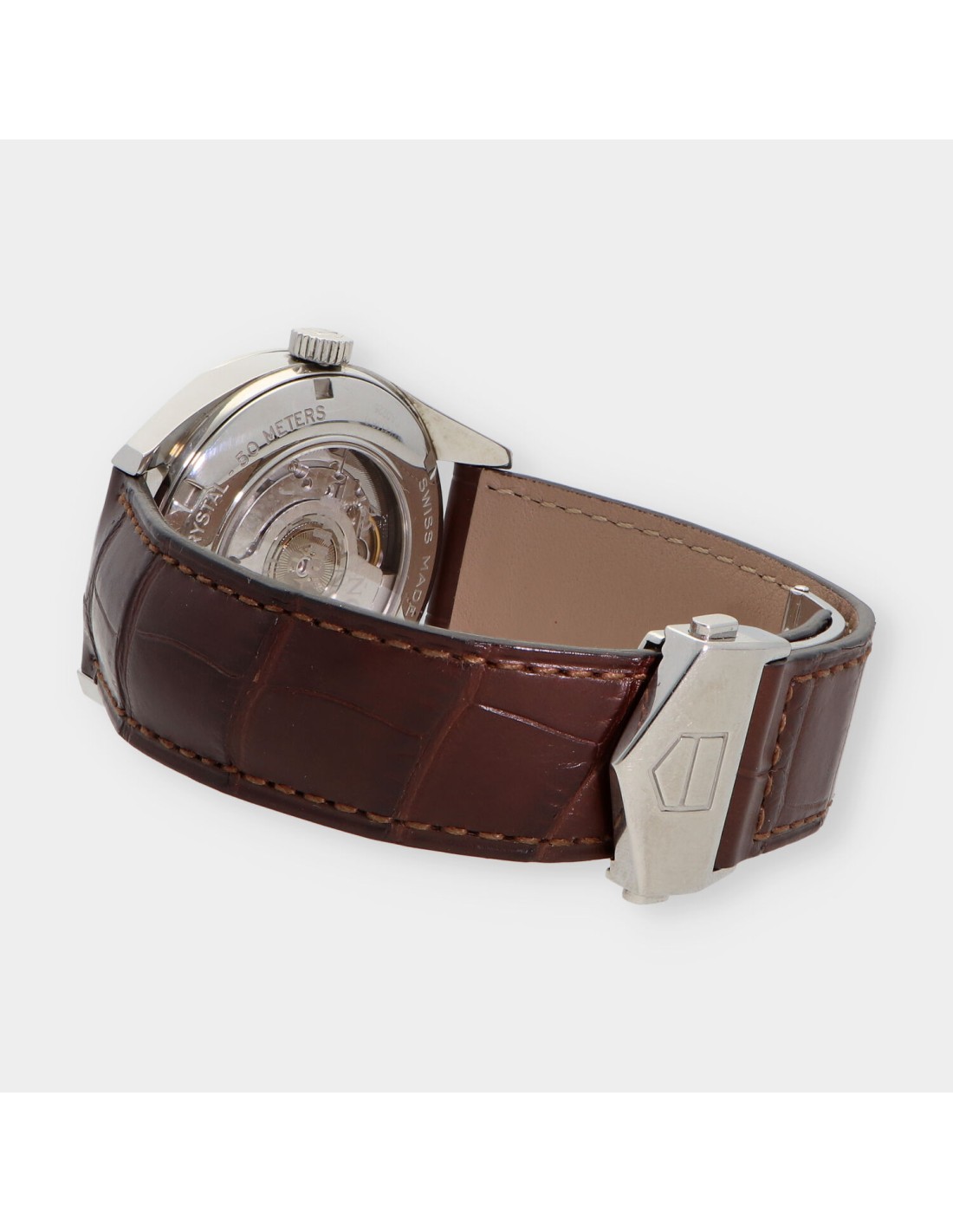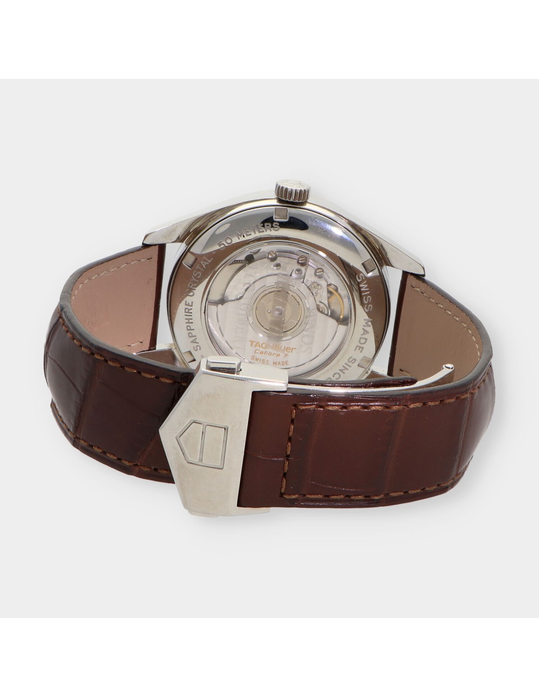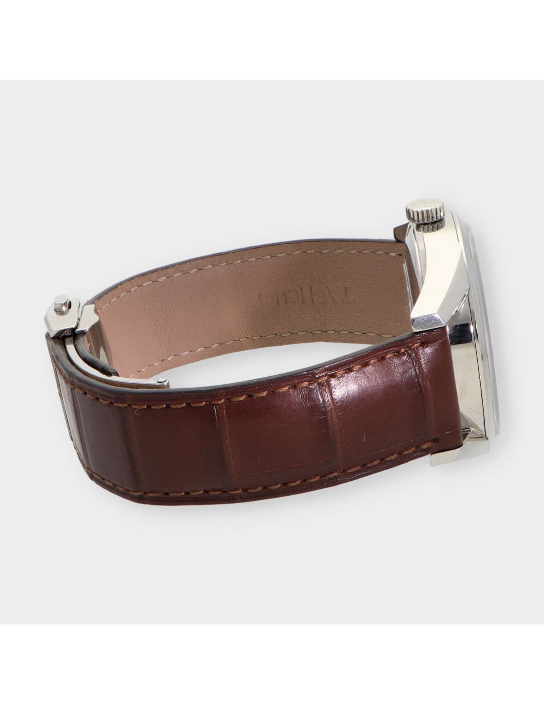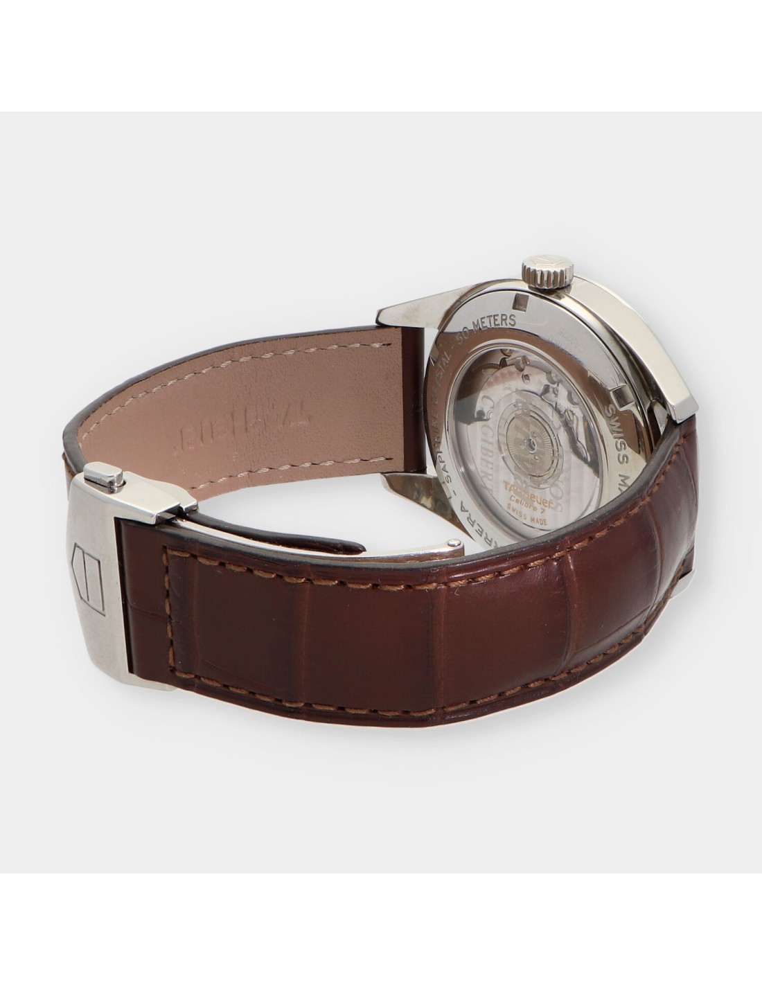Magnifico tag Heuer Carrera de segunda mano en perfecto estado de marcha y conservación. Ref: WV2116 de cuerda automática con caja  de 39mm en acero, cristal zafiro, fondo blanco sin cifras y con números arábigos en el bisel. Correa de piel en color marrón con cierre en acero.